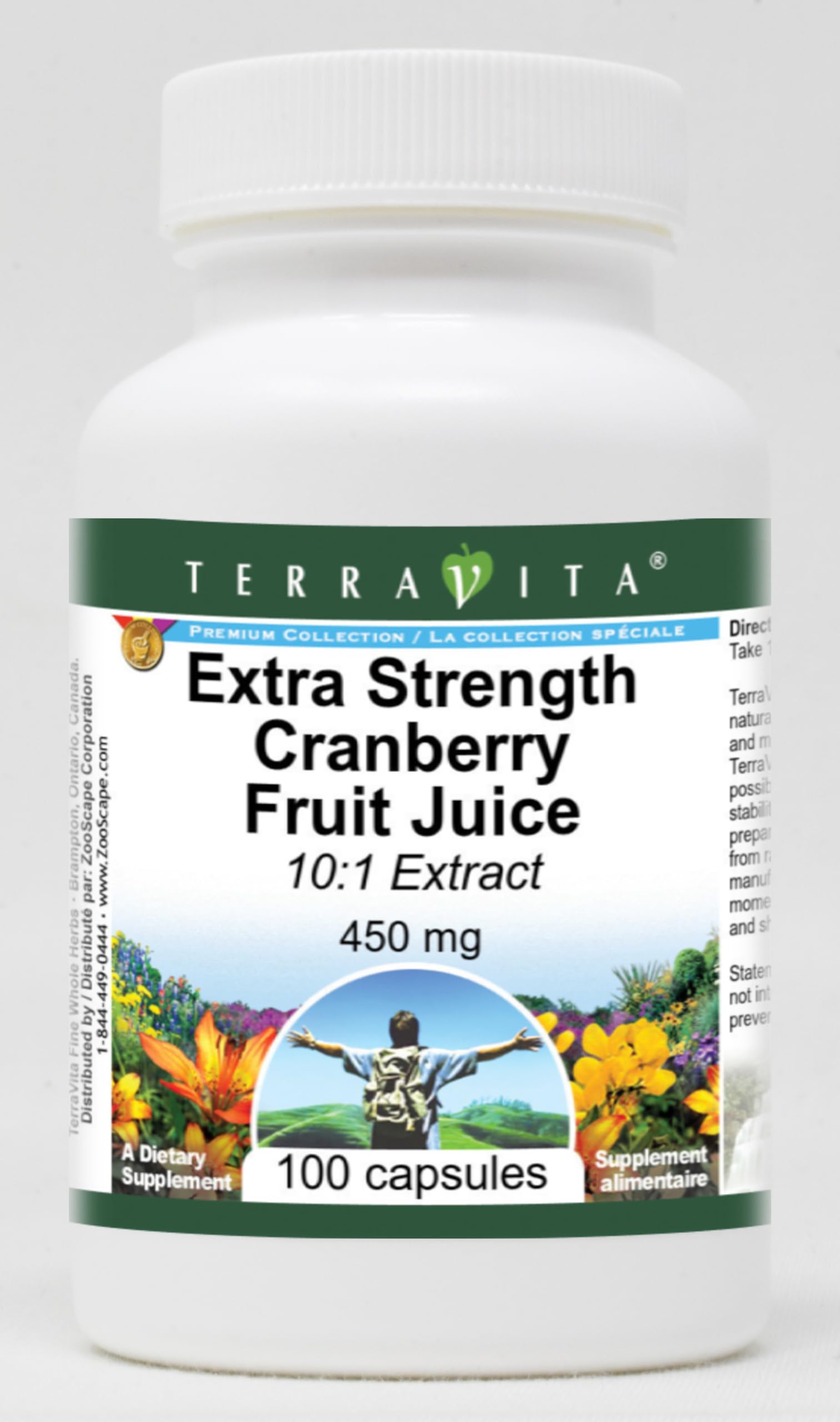 Easy-to-swallow Capsules in a sealed bottle. Size: 100 capsules. Manufacturer: TerraVita. No fillers. Extra Strength Cranberry Fruit Juice 10:1 Extract - 450 mg (100 capsules, ZIN: 512972).
