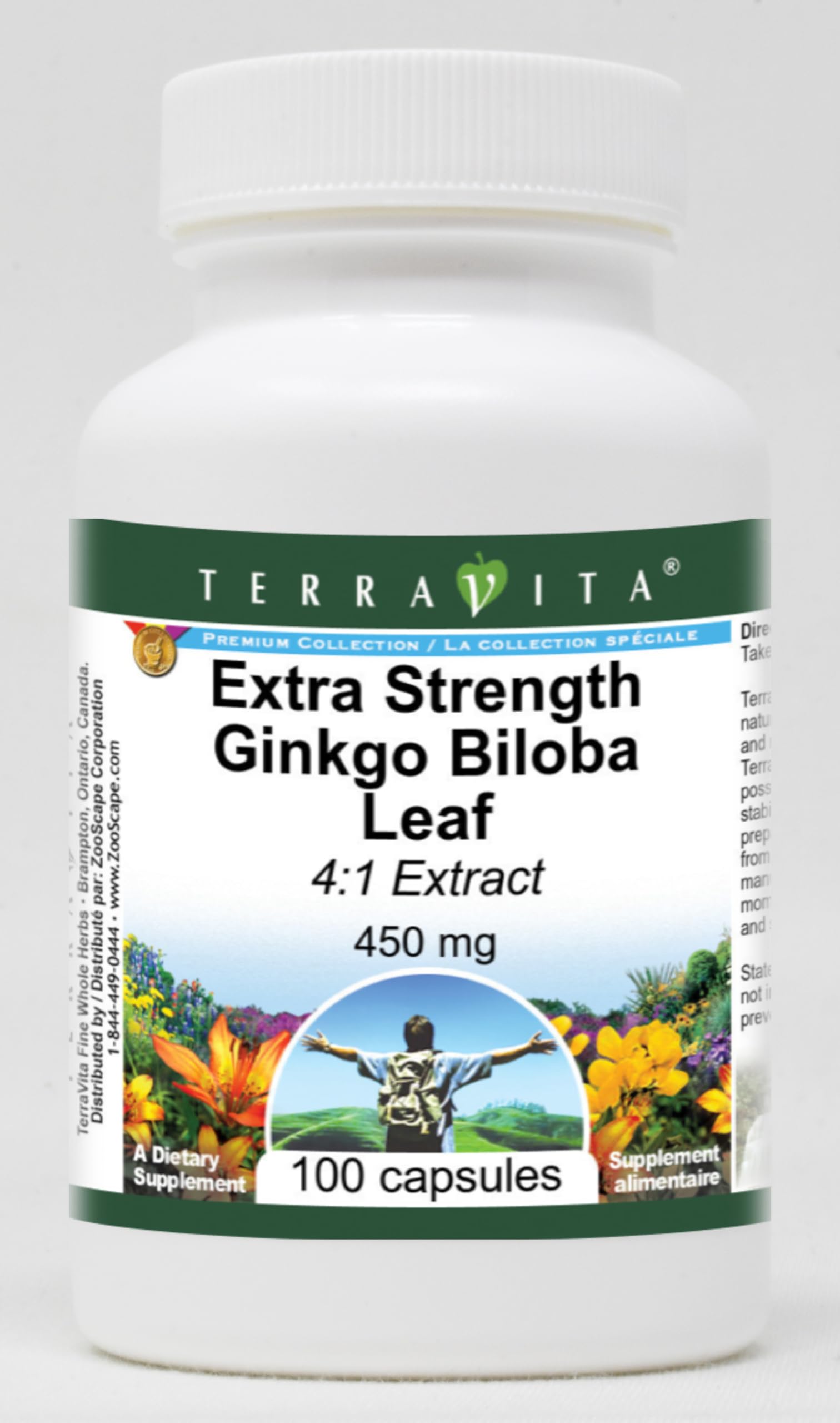 Extra Strength Ginkgo Biloba Leaf 4:1 Extract - 450 mg (100 capsules, ZIN: 514331) Packaged in the United States in a GMP certified facility (Good Manufacturing Practice). No fillers. Manufacturer: TerraVita Size: 100 capsules Easy-to-swallow Capsules in a sealed bottle. Ingredients: Gelatin, Water, Ginkgo Biloba Leaf - 1800 mg (Standardized Extract 4:1)