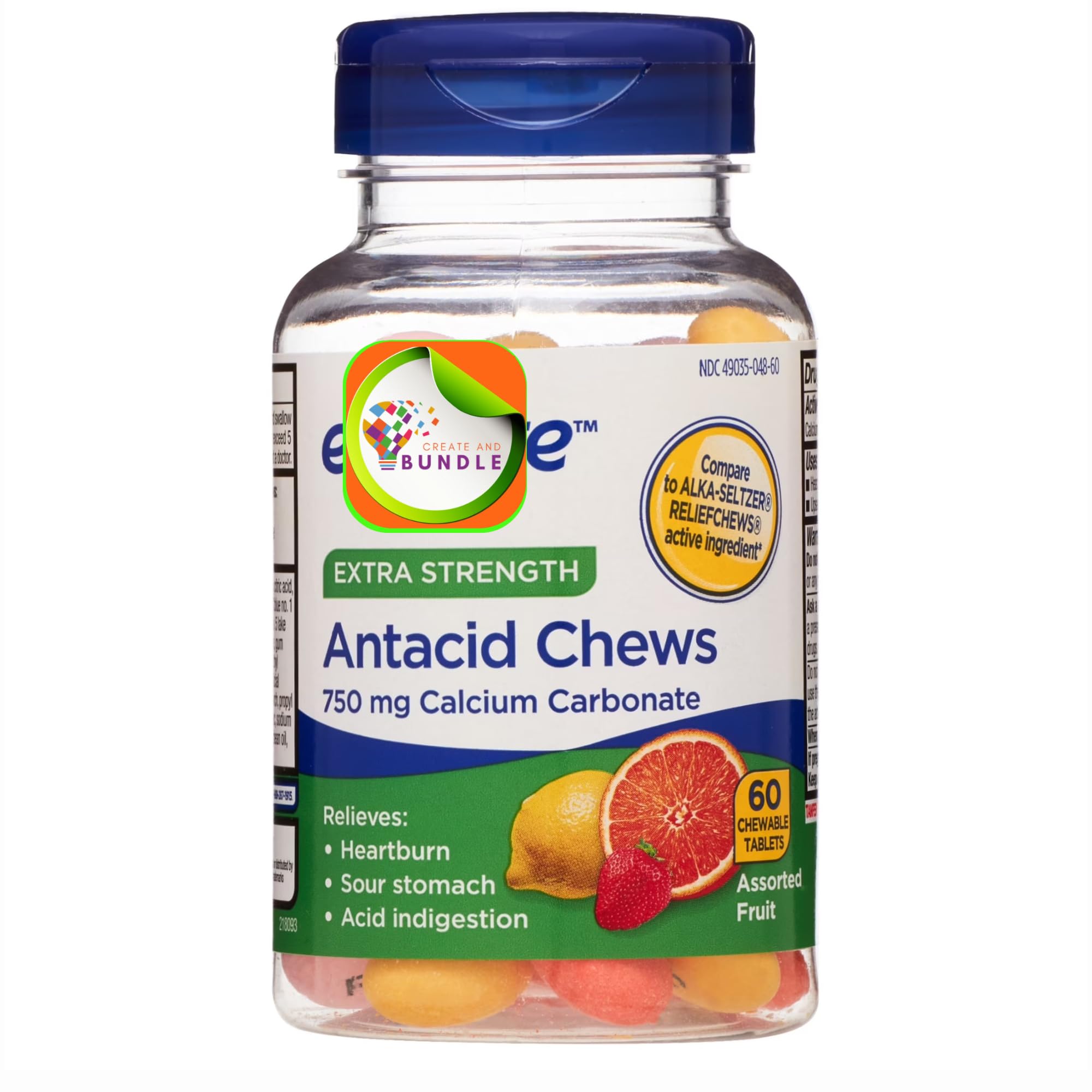 Enjoy quick and convenient digestive support with these extra strength antacid chews. Formulated with calcium carbonate, they are designed to help neutralize occasional acid indigestion, heartburn, and sour stomach. Each chewable tablet provides 300 mg of calcium and 1 mg of magnesium, offering both effectiveness and an added source of calcium. These extra strength antacid chews are a convenient option for occasional heartburn, sour stomach, and acid indigestion. Formulated with calcium carbonate, each chewable tablet provides reliable digestive support while also supplying 300 mg of calcium and 1 mg of magnesium. With assorted fruit flavors, the chews are smooth, pleasant-tasting, and easy to take without the need for water. This bottle contains 60 chewable tablets, making it a practical size for keeping at home, in the office, or carrying during travel. Designed for adults and children ages 12 and older, these antacid chews offer a simple solution for maintaining digestive comfort in daily life. Please note: this product contains soy and is not recommended for individuals with soy sensitivities.