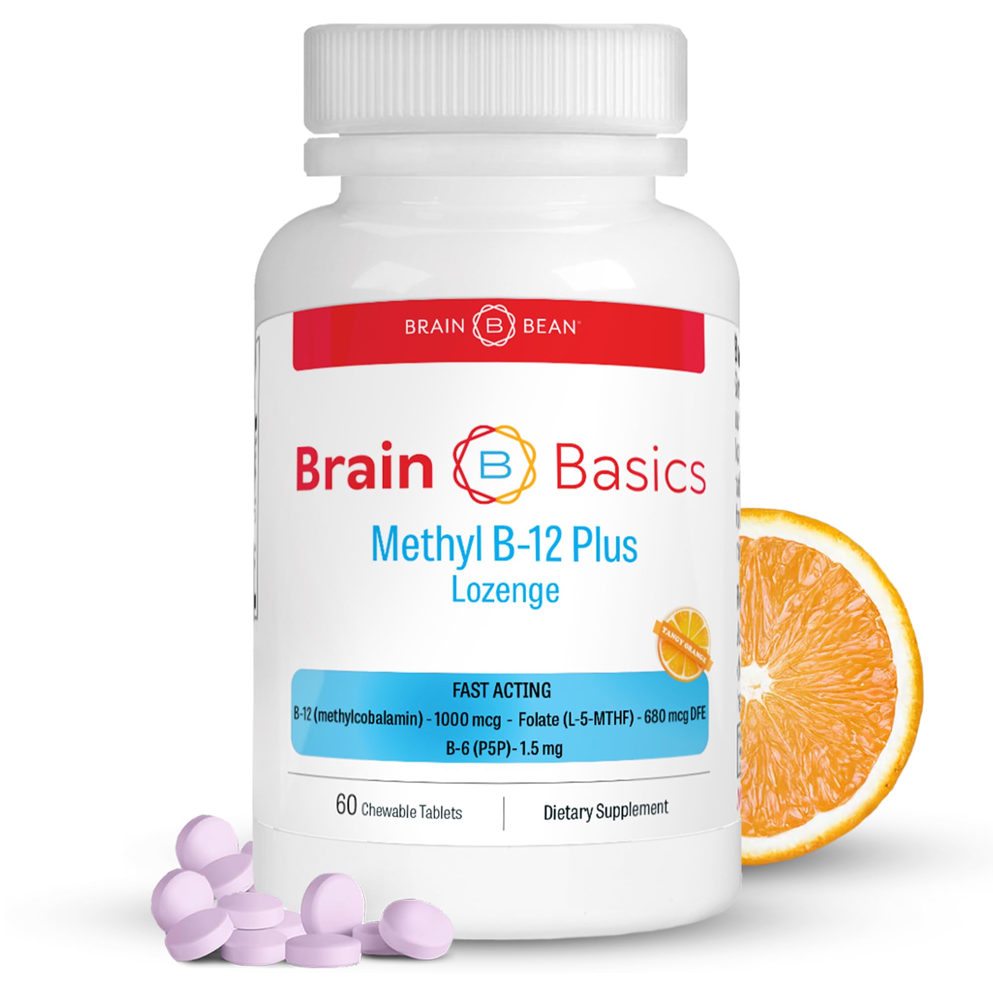 Support your body's natural energy, brain function, and cardiovascular health with our Ultra Strength Methyl B-12 Methyl Folate supplement. Each chewable tablet provides a potent dose of 1,000 mcg of methylcobalamin (B-12) and 400 mcg of methyl folate (5-MTHF)—two crucial B vitamins essential for energy metabolism, nerve function, and cognitive support. Unlike synthetic B vitamins, our formula ensures better absorption and effectiveness, making it ideal for individuals with MTHFR gene mutations or those looking for a superior B-12 supplement. We've also included Pyridoxal-5-Phosphate (P5P), the active form of Vitamin B6, to further aid in homocysteine regulation and enhance cardiovascular benefits. Designed for convenience, these delicious orange citrus chewables eliminate the need for hard-to-swallow pills while providing a burst of essential nutrients. Whether you're looking to combat fatigue, improve mental clarity, or support overall wellness, this formula is the perfect daily companion for a healthier, more vibrant you! Suggested Use: Chew one tablet daily or as directed by your healthcare provider. No need to swallow pills—simply chew and enjoy the refreshing orange citrus flavor! Ingredients: Methylcobalamin (Vitamin B-12) – 1000 mcg, Methyl Folate (5-MTHF) – 400 mcg, Pyridoxal-5-Phosphate (Vitamin B6) – 1.5 mg, natural orange citrus flavor, xylitol, stearic acid, magnesium stearate, citric acid. Frequently Asked Questions (FAQs): Q: Are these chewable safe for vegetarians and vegans? A: Yes! Our formula is vegetarian-friendly and contains no animal-derived ingredients. Q: Can this supplement help with fatigue and low energy? A: Absolutely! B-12 is essential for red blood cell production and energy metabolism, helping to reduce fatigue and boost vitality. Q: Is this product free from artificial ingredients and common allergens? A: Yes! Our chewable tablets contain no artificial colors, flavors, gluten, dairy, soy, or preservatives. : Our Brain Basic wellness formula is developed based on scientific research and crafted with precision to deliver the full benefits of each vitamin, mineral, and supplement. Produced in a cGMP-certified, FDA-registered, and USDA Organic facility, every product meets strict quality and safety standards to ensure effectiveness and consistency. - , - : Enjoy a refreshing citrus-flavored lozenge that provides 1.5 mg of Vitamin B6, methyl folate 400 mcg, and vitamin b12 1000 mcg in a fast-dissolving, convenient format. No need to swallow large pills! Made without wheat, gluten, soy, dairy, eggs, fish, shellfish, peanuts, tree nuts, or sesame. , : Methyl B12 and Methyl Folate work together to support brain health, cognitive performance, and mental clarity by aiding neurotransmitter activity. These essential vitamin B12 supplement also help maintain balanced homocysteine levels for heart and circulatory health while promoting proper nerve function and signal transmission. Ideal for anyone looking to enhance focus, memory, and overall well-being. : Vitamin B12 is essential for red blood cell formation and energy metabolism, helping to combat occasional tiredness and sluggishness. By supporting cellular function, this methyl folate supplement helps you stay active and alert throughout the day—without relying on caffeine or stimulants. : Formulated with methyl cobalamin (B-12) and methyl folate (5-MTHF), the active forms of these essential B vitamins, ensuring superior absorption and bioavailability. Unlike synthetic forms, these methylated b12 vitamins are easily utilized by the body to support energy, brain function, and nerve health.
