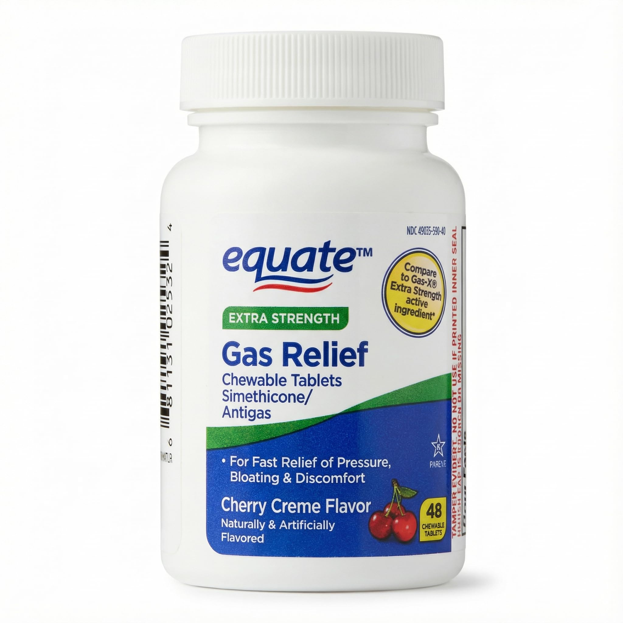 MAXIMUM STRENGTH CHEWABLE GAS RELIEF OPTION - Extra strength gas relief tablets formulated with simethicone, providing a practical chewable solution for adult digestive comfort needs. CONVENIENT CHEWABLE TABLET FORMAT - Tablet-style chewables allow simple intake without water, fitting naturally into daily wellness and digestive support routines. ANTI GAS TABLETS FOR ADULT USE - Gas relief chewable tablets designed for adults, supporting everyday comfort related to digestive gas from common food intake. CHERRY CRÈME FLAVORED CHEWABLE TABLETS - Smooth chewable gas relief tablets featuring a sweet cherry crème taste, offering an easy alternative for those who prefer chewables over pills. EXTRA STRENGTH SIMETHICONE GAS RELIEF - Chewable anti gas tablets made with simethicone, developed to support comfort during gas buildup and bloating as part of adult digestive routines.