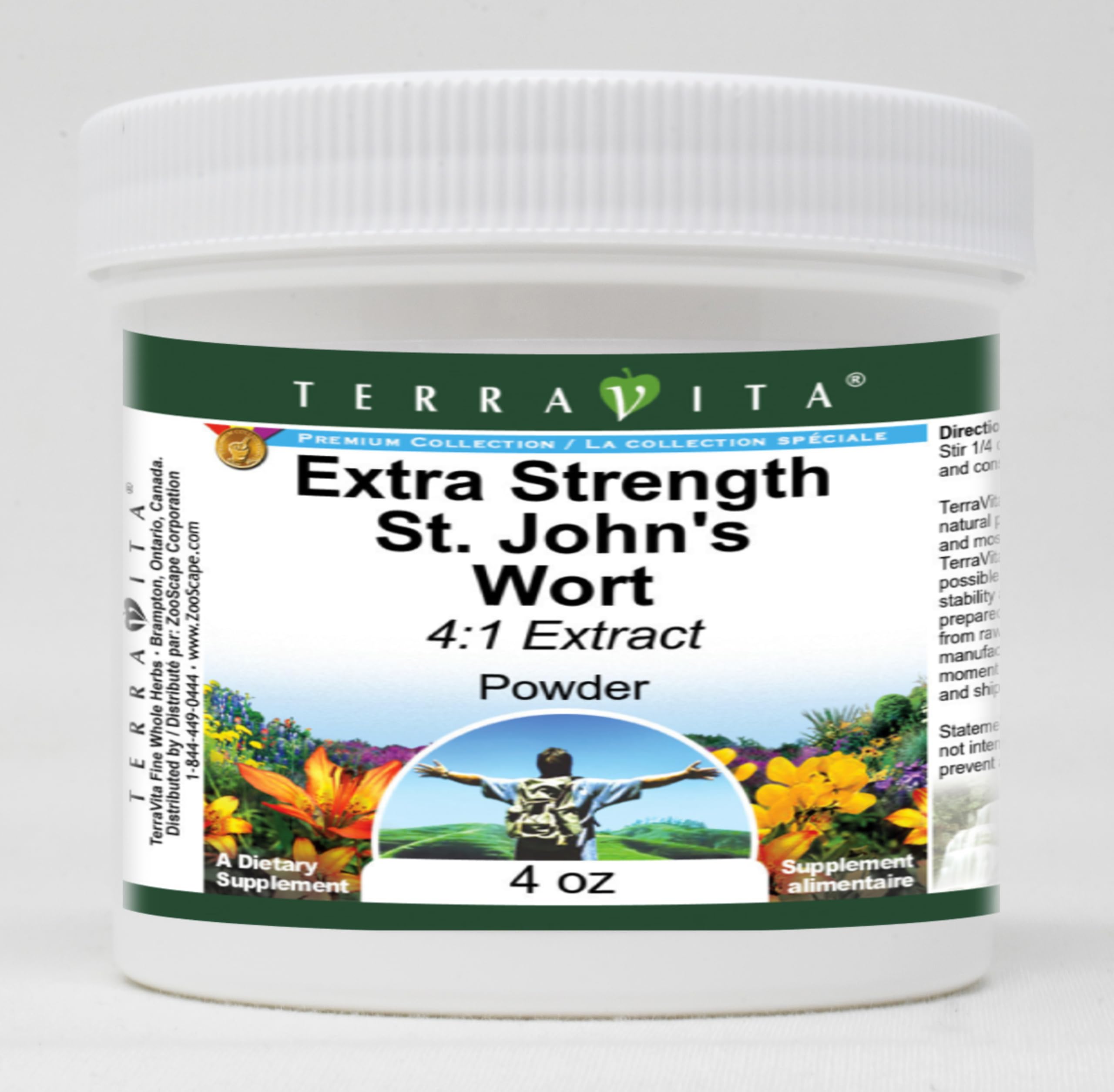 Convenient Powder format. Size: 4 oz. Manufacturer: TerraVita. No fillers. Extra Strength St. John's Wort 4:1 Extract Powder (4 oz, ZIN: 512945).