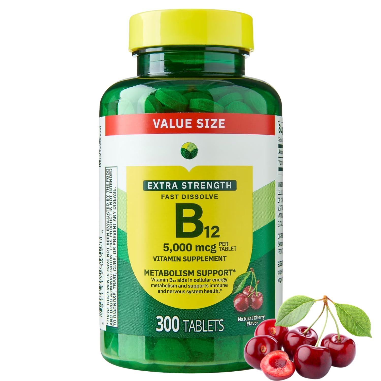 Clean Formula – Free from gluten, dairy, soy, and artificial colors or preservatives. Generous Supply – 300-count bottle offers a long-term supply for consistent supplementation. Cherry Flavor – Pleasant cherry taste with no artificial sweeteners or dyes. Fast-Dissolve Convenience – Takes effect quickly without needing water, ideal for on-the-go use. High-Potency B12 – Each fast-dissolve tablet delivers 5,000 mcg of vitamin B12 for strong daily support. .
