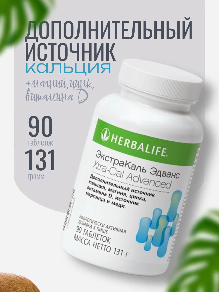 ЭкстраКаль Эдванс от Herbalife Гербалайф - это дополнительный источник кальция и микроэлементов для поддержки костной ткани и опорно-двигательного аппарата. Содержит витамин D. 131 г. (90 таблеток). Взрослым по 1 таблетке 2-3 раза в день во время еды.