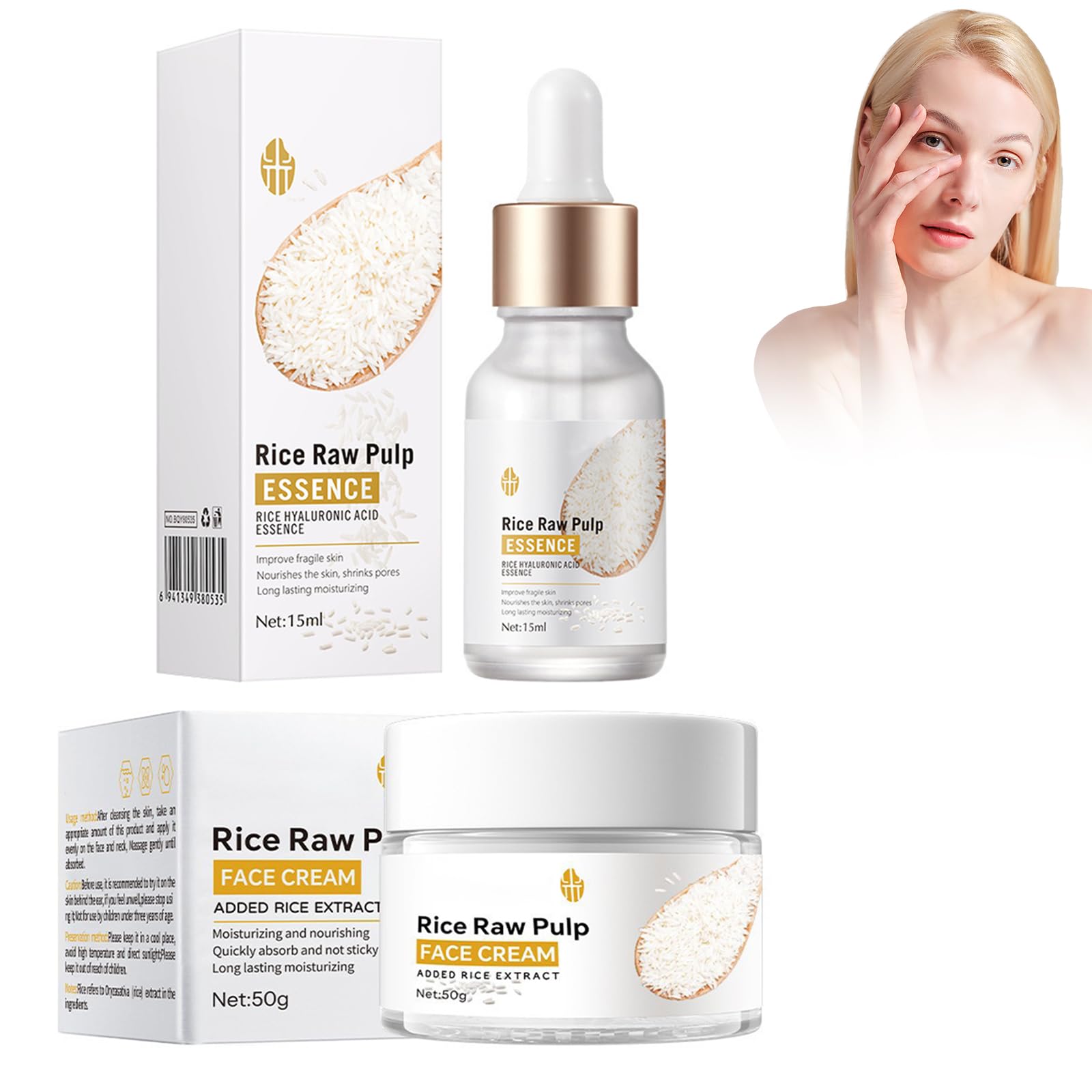 Extrait de riz, 15ml Essence de riz anti-rides et 50g Crème pour le visage au riz, Hydratation en profondeur, Nourrit et répare la barrière cutanée, Réduit la pigmentation, serum