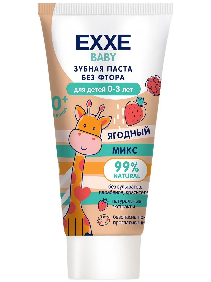 Зубная паста EXXE Baby для детей 0-3 лет, без фтора, ягодный микс, 50 г. Зубная паста EXXE без фтора для детей 0-3 лет. Натуральная зубная паста для детей (0-3 лет) с ягодным вкусом. Комплексная гигиена полости рта с первого зубика! Кальций и ксилит предотвращают образование налета и защищают от кариеса. Экстракты шиповника, малины, клубники и липы деликатно ухаживают за деснами. Не содержит фтор. НЕ СОДЕРЖИТ: сульфатов, фтора, хлоргексидина, диоксида титана, красителей, парабенов. рекомендуется чистить зубы дважды в день небольшим количеством пасты размером с горошину.