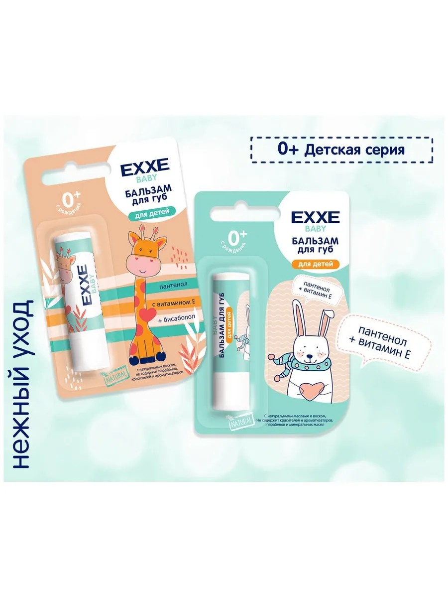 Выбор животного рандомное! Бальзам для губ EXXE Baby для детей для ежедневного ухода за нежной кожей губ. Благодаря особой формуле с натуральными маслами и воском идеально подходит для детей. Пантенол и Витамин Е смягчают и защищают от обветривания, бисаболол и витамин А увлажняют и восстанавливают кожу губ, устраняют шелушения.