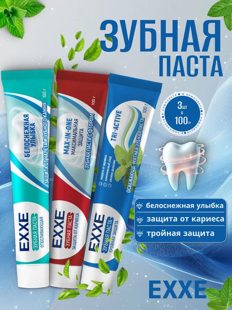 EXXE Зубная паста Тройная защита tri-active обеспечивает тройное действие: защищает от кариеса, укрепляет дёсны и предотвращает образование зубного камня. Благодаря содержанию фтора и других активных компонентов, паста помогает поддерживать здоровье зубов и дёсен.