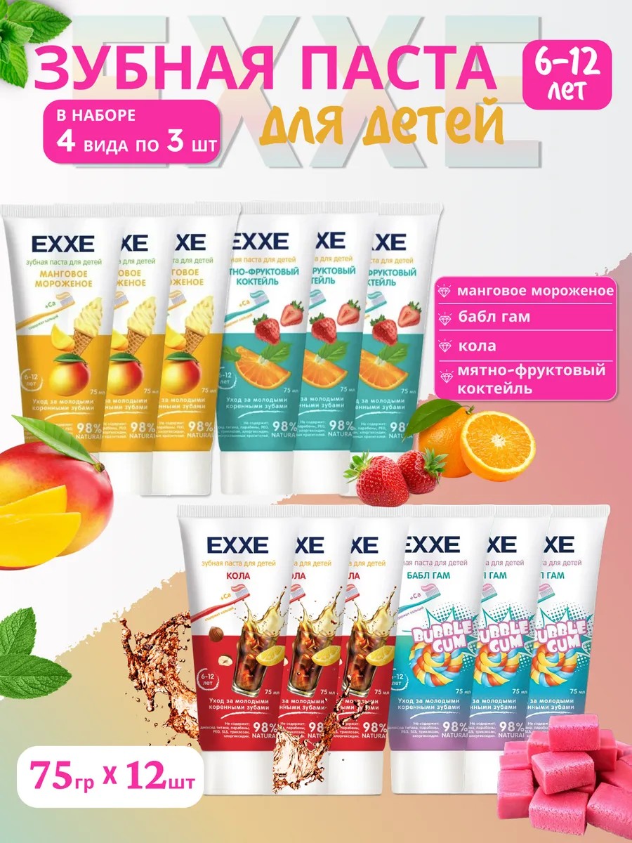 Set of 12 EXXE children's toothpastes, 6-12 years, 75 ml. EXXE children's toothpaste set: Mango Ice Cream, Cola, Bubble Gum, Mint-Fruit Cocktail. Children's toothpaste, 75 ml. is designed for daily care of young permanent teeth. Toothpaste for babies, with a pleasant taste, with a smooth gel consistency. Children's toothpaste contains fluoride, calcium, xylitol, chamomile and calendula extracts. The toothpaste soothes, protects against inflammation and cavities, strengthens enamel, prevents plaque formation, and freshens breath. Children's toothpaste is an excellent cleanser for children and an indicator of dental cleanliness for parents. Purchasing EXXE toothpaste in a set of several packages allows you to save up to 30-50% on the cost of a single tube.