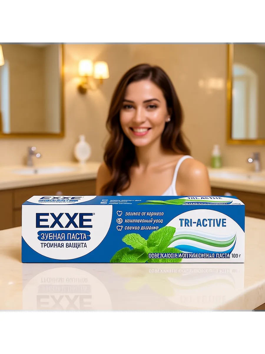 Зубная паста EXXE Тройная защита Tri-Active — комплексный уход для здоровой и свежей улыбки.