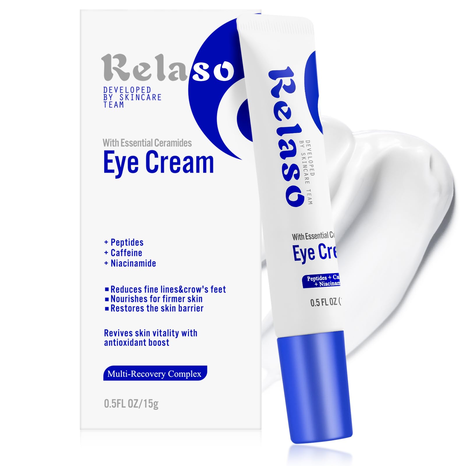 Clean Gentle Formula Vegan, cruelty-free, and free from fragrance, parabens, and sulfates. Skin care team tested for all skin types, including sensitive skin. The lightweight texture layers seamlessly alone or under makeup and sunscreen, AM PM. Deeply Hydrates Plumps This eye treatment features Sodium Hyaluronate and antioxidants that penetrate deeply to intensely hydrate, plump, and quench dehydrated under-eyes. It delivers a toned, smoother contour, diminishes dark circles and puffiness, and refreshes tired eyes day or night. Powerhouse Anti-Aging Ingredients Infused with peptides that boost collagen production, this formula helps smooth the appearance of fine lines and strengthens the skin barrier by restoring the stratum corneum. Caffeine visibly reduces puffiness, dark circles, and under-eye bags. Niacinamide provides deep hydration and firms delicate contours to reveal a lifted, rejuvenated appearance. Triple Essential Ceramides Ceramide is the essential lipid that makes up about 50 of your skin's barrier. Our eye cream formulated with 3 Essential Ceramides (NP, AP, EOP) to repair and maintain the skin barrier. Visibly reduces fine lines, crow's feet, and crepiness for firmer, more resilient under-eyes. Effective Wrinkle-Reducing Benefits Relaso Anti Aging Eye Cream diminishes fine lines and crow's feet while firming delicate skin around the eyes for a lifted contour. It provides all-day protection while deeply moisturizing to renew vitality and restore the skin barrier—revealing smoother, youthful radiance.