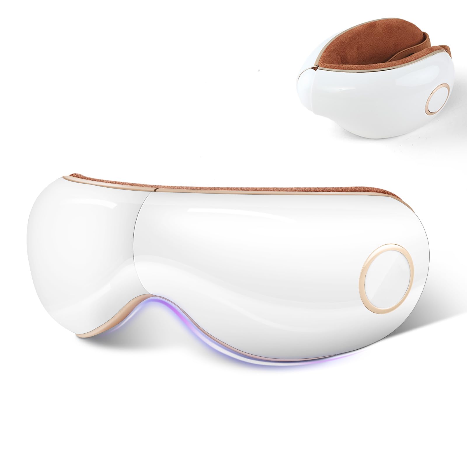 ?Best gift option?:Each eye massager is beautifully packaged in a gift box and portable cloth bag, pending to give you an excellent shopping experience. It is the best choice for family and friends as a birthday gift and holiday gift.Available in a variety of colors, this is a great gift for both men and women!. ?High-quality sound?:The eye massager for migraine is equipped with a high-quality sound, so you can importing your favorite music into massager as you wish. In addition the massager's built-in memory comes with 11 music tracks. You can enjoy the music while massaging to help you relax better and fall asleep faster. ?Rechargeable and healthy massage?:This eye mask massager is rechargeable ,and takes 4 hours to be fully charged, and can be used for about 1 week. We recommend 15-minute massage every day to relieve eye fatigue and dry eyes.The massager will stop automatically after 15 minutes of each massage. If you want a longer massage, please turn on it again. ?Multiple massage modes?:For reducing eye strain and improving sleeping,this temple massager has 4 massage states: heating, vibrating, air pressure, music. These massage states combine to form 5 massage modes: auto mode,dynamic mode,clear mode,sleep mode,hot compress.Comfortable heating temperature :104 - 107 degrees Fahrenheit(40?-42?). ?Portable and humanized design?:The eye massager is 180 degrees foldable and can be easily packed into a suitcase for a relaxing trip. The shape of the eye massager has been designed according to the curves of the human face, and the straps are elastic and adjustable, which allows it to perfectly fit the contours of your eyes.