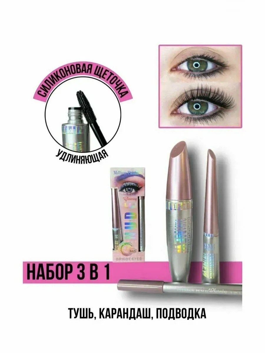 | Комплектация | Лайнер для стрелок; Водостойкая тушь для ресниц; черный карандаш для глаз для слизистой |