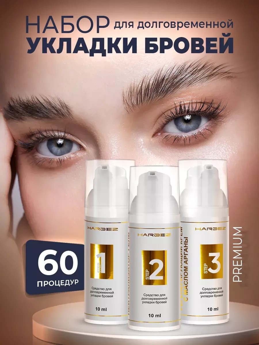 Long-term eyebrow styling is a beauty treatment. This professional kit from HARBEZ includes three ingredients. 1. A permanent gel softens and opens the hair cuticle. 2. A liquid cream-neutralizer hardens keratin and preserves new bonds formed in the hair. 3. Regenerating argan cream-oil seals the effect within the hair, increasing its durability. The care products are made of soft, non-irritating materials. Super-hold products shape brows, highlight and fill in sparse hairs, giving them a natural look. Shaping and coloring can be done not only in a beauty salon but also at home. Use stencils, a brush, and other brushes. The lamination effect can last up to a month. For the first 24 hours after long-term styling, avoid getting the product wet, steaming, decorative cosmetics (makeup), toners, and scrubs. A briefing is recommended before the procedure. First, style, then shape, and then pluck. Do not apply to damaged skin! You can also find our brand by searching for: long-lasting eyebrow styling, long-lasting eyebrow styling, long-lasting eyebrow styling kit, Harbez, eyelash lamination products, eyelash lamination, eyelash and eyebrow lamination kits, eyebrow tinting kits, long-lasting eyelash styling, eyebrow shaping.