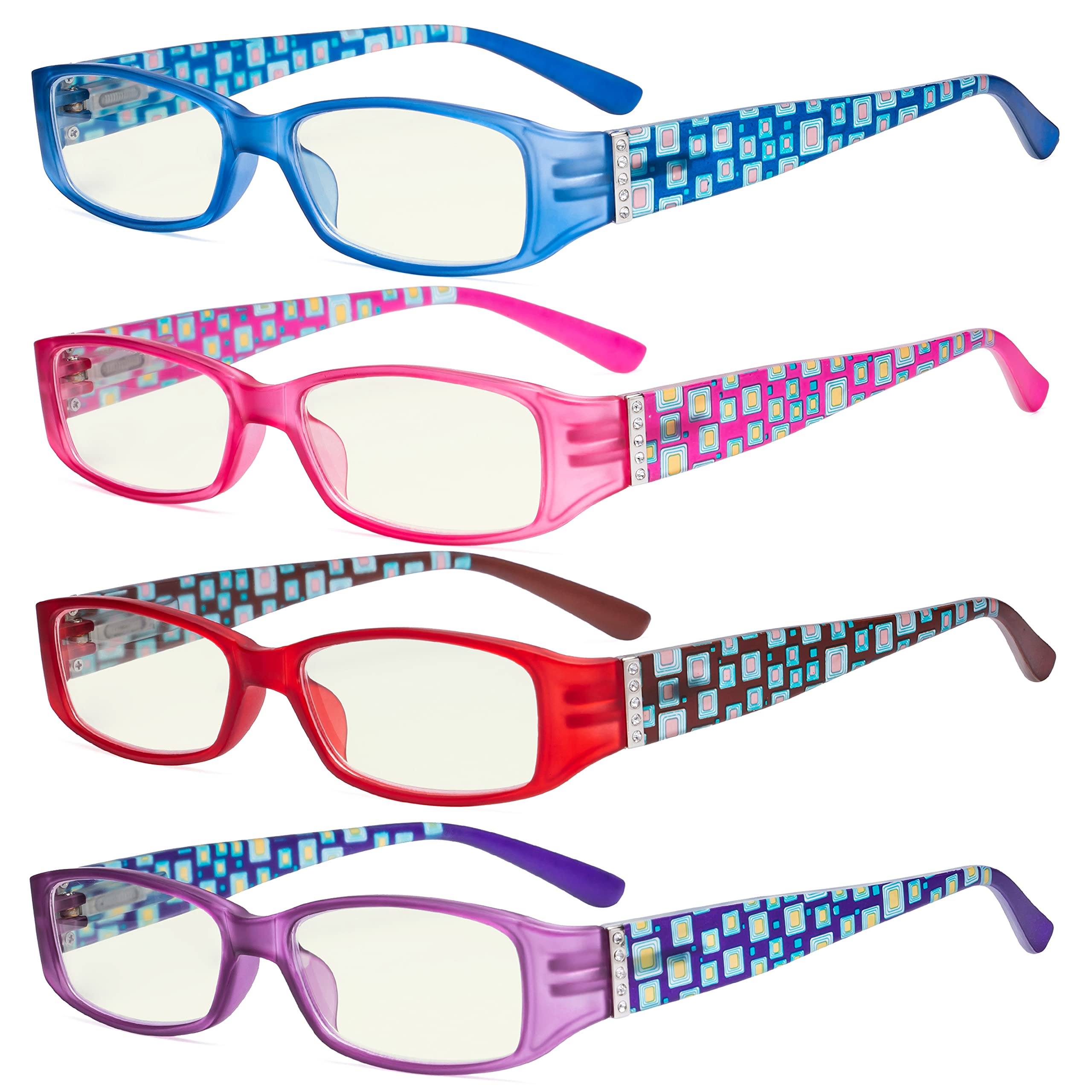 Worry-free Shopping ? 100% risk free to try any broken problem happens, just contact the seller Eyekepper without any hesitation to solve the problem until you are satisfied. You have no risk to try our computer readers. 4 Pack of Blue Light Blocking Readers ? convenient Set of 4 blue light block glasses means you'll have a pair handy wherever you are. Keep a pair in your favorite reading spots. Spring Hinges Blue Light Blocking Eyeglasses ? ultra-light and flexible resin frame material for durability and comfortable long-term wearing. Casual frame design keeps you looking cute and stylish while working or playing video games. Explosion Proof Blue Light Filter Lenses ? reduce eyestrain, anti blue ray to a great extent. Enjoy your digital time, NO worry about eye fatigue, blurred vision and headache, let you have a better sleep. Anti Blue Light Reading Glasses ? blue light blocker and UV400 Lenses, Alleviates visual fatigue and discomfort from browsing mobile phones, tablets, gaming and working under fluorescent lights with UVAand UVB protection and glare reduction.
