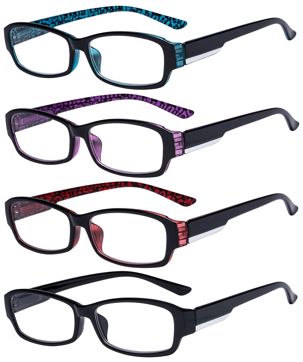 Reading Optically correct and spring-loaded hinges. Quality ReadersS - FDA Registered Reading Glasses and Eyewear. Eyekepper Womens Reading Glasses - 4 pack , Sets come in 1 power of your choice, these are not mixed powers. Stylish frames, look good on any face. Spring-hinged temples, help glasses fit your face. Eyekepper Reading Glasses Optical Performance - The pupil distance is 59-63mm, the deviation for pupil distance less than 2mm, the deviation for strength less than 0.02, the deviation for lenses's horizontal line less than 1mm. Products Dimension - Frame Material is Plastic,Lens width about 2 1/16 inches(53mm),Frame width about 5 1/4 inches(133mm),Lens height about 1 1/8 inches(28mm),Frame height about 1 1/4 inches(32mm),Bridge(DBL) about 9/16 inches(15mm),Temple length about 5 7/16 inches(138mm),with spring hinge.