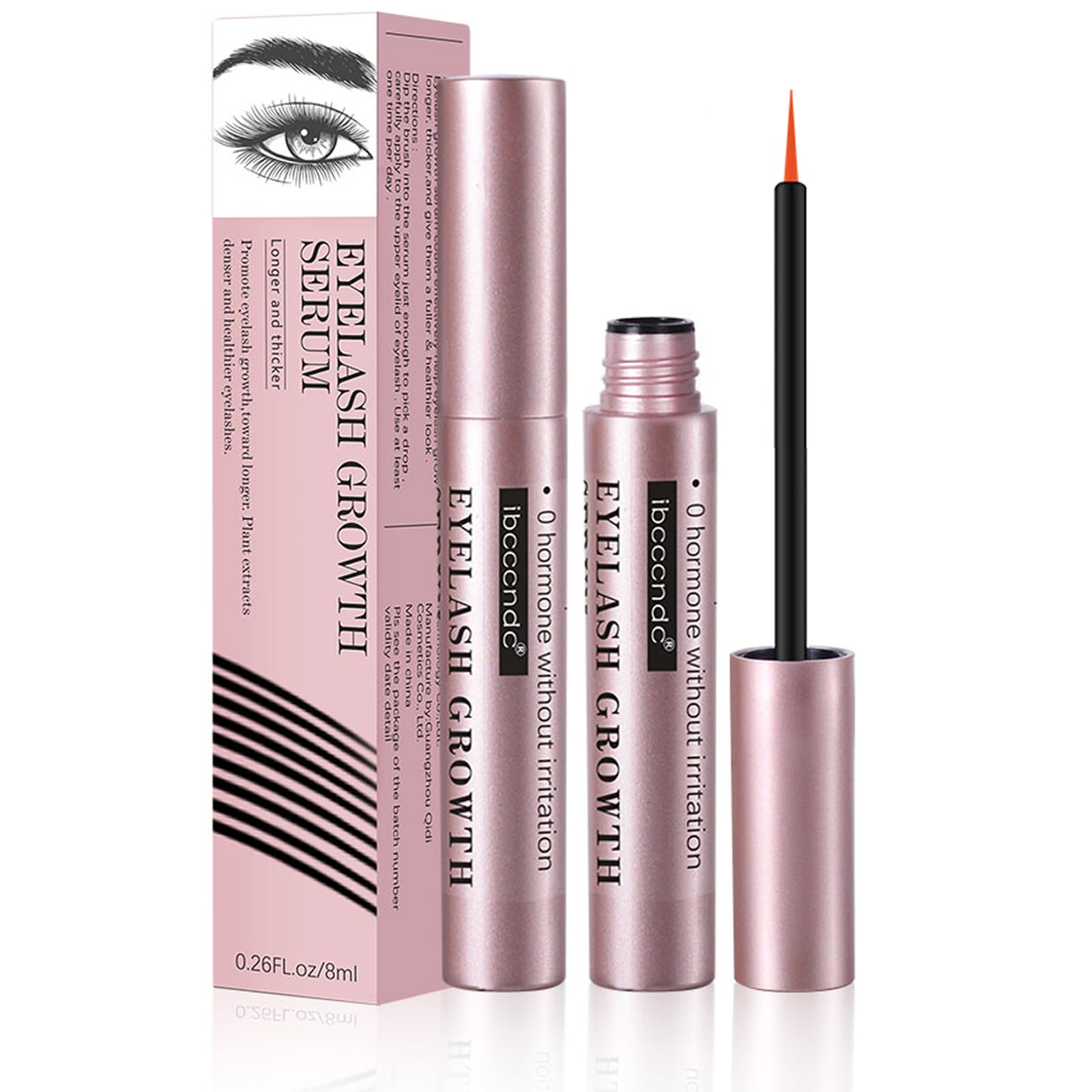 Eyelash serum product with pink metallic tube and applicator brush. Advertises accelerated eyelash growth, hair follicle activation, repair, and deep nourishment.
