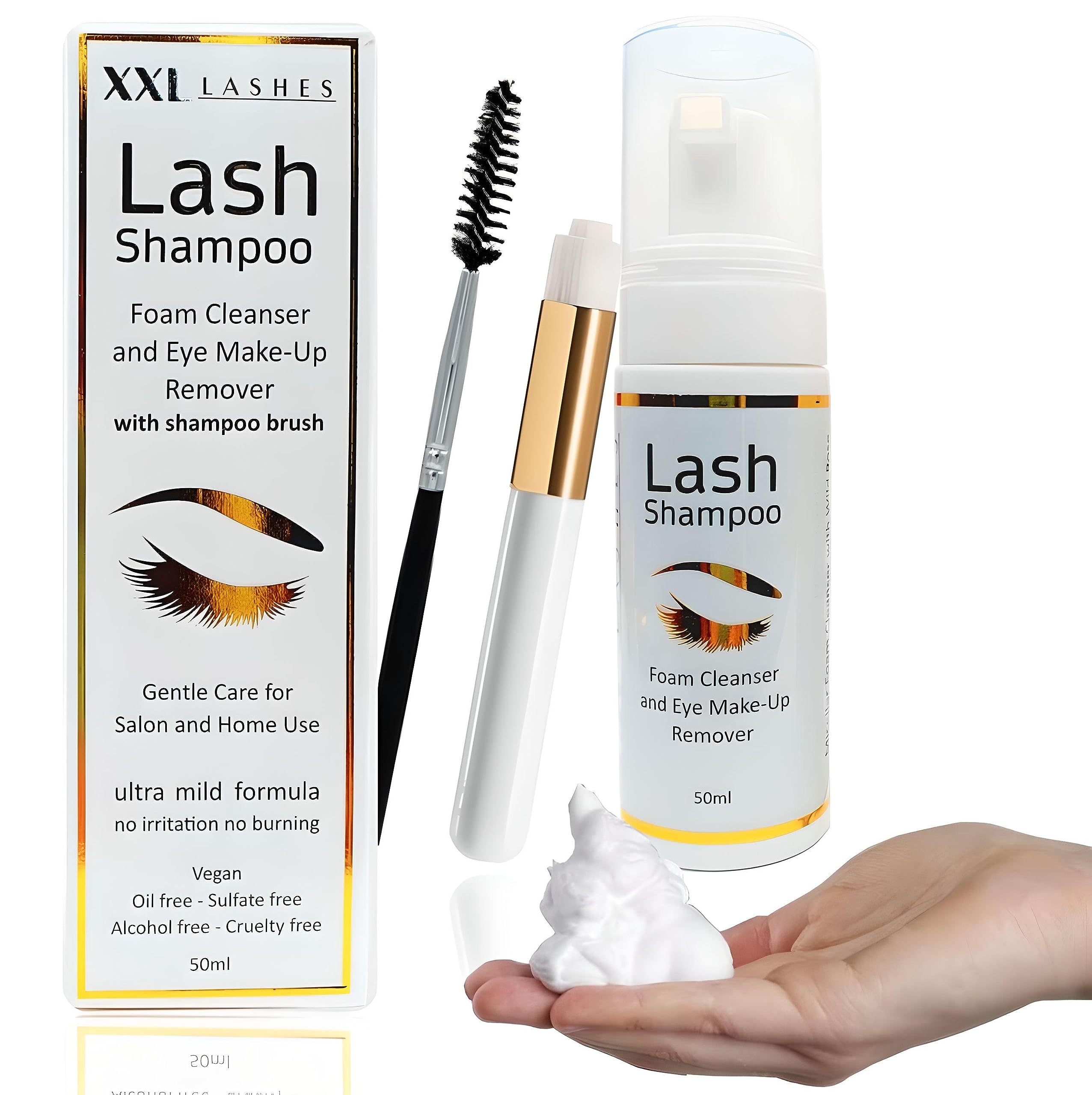 ?? More for the money: The included, professional cleaning brush for eyelash shampoo gets better into the gaps and is particularly soft so as not to irritate the delicate skin on the eye.It allows a gentle application of the mild cleaning foam without damaging the extensions and attacking the glue points.In addition, the artificial eyelashes remain so smooth and soft.?? Why the XXL lashes eyelashes shampoo has become a price-performance winner: it has been dermatologically tested and has a pH value that corresponds to that of the natural tear fluid and has an effect.Its ingredients donate refreshing moisture and have no negative effect on the shelf life of the eyelash adhesive.It removes make-up, dust and fat and impurities on the eyelid, thus prevents infections and increases the wearing time of the expensive eyelash extensions.?? A micellar water is an aqueous lotion with micelles.Mizelles are nanocleine surfactants, i.e. washing-active molecules that can remove fat and water-soluble particles.They act like a magnet on dirt and make-up.This is mainly due to its structure.That is why micelle water cleans quickly, easily and particularly gently and effective.It is now part of the standard equipment in the eyelash salon and bathroom cabinet for many.?? The micelle shampoo is one of the ""softies"" among the eyelash cleaning products.It cleans the eyelashes and the eyelid deep clean, but it goes very well.Nanocleine particles in the shampoo make the big difference here - and enable gentle eyelash linen.?? The test winner for the gentle cleaning of eyelash extensions, tested under ophthalmological and dermatological control, allergy sufferers, 100 % vegan.It has a pH value that corresponds to that of the natural tear fluid and thus has a nourishing effect.Because of its foam nozzle, it has a very delicate texture and is specially made for cleaning eyelashes before application and maintaining the eyelash extensions.Washing the extensions extends their durability.?? Mehr fürs Geld: Die mitgelieferte, professionelle Reinigungsbürste für Wimpernshampoo gelangt besser in die Zwischenräume und ist besonders soft, um die zarte Haut am Auge nicht zu reizen. Sie erlaubt ein schonendes Auftragen des milden Reinigungsschaums, ohne die Extensions zu beschädigen und die Klebestellen anzugreifen. Außerdem bleiben die künstlichen Wimpern so geschmeidig und weich. ?? Warum das XXL Lashes Wimpern Shampoo ein Preis-Leistungs-Sieger geworden ist: Es wurde dermatologisch getestet und hat einen ph-Wert, der dem der natürlichen Tränenflüssigkeit entspricht und pflegend wirkt. Seine Inhaltsstoffe spenden erfrischende Feuchtigkeit und haben keine negative Auswirkung auf die Haltbarkeit des Wimpernklebers. Es entfernt Make-up, Staub und Fett und Unreinheiten am Augenlid, beugt so Infektionen vor und erhöht die Tragedauer der teuren Wimpernverlängerungen. ?? Bei einem Mizellenwasser handelt es sich um eine wässrige Lotion mit Mizellen. Mizellen sind nanokleine Tenside, also waschaktive Moleküle, die fett- und wasserlösliche Partikel entfernen können. Sie wirken dabei wie ein Magnet auf Schmutz und Make-up. Dies liegt vor allem an ihrer Struktur. Deshalb reinigt Mizellenwasser schnell, einfach sowie besonders sanft und effektiv. Es gehört inzwischen bei vielen zur Standardausstattung im Wimpernsalon und Badezimmerschrank. ?? Das Mizellen Shampoo zählt zu den „Softies“ unter den Wimpern-Reinigungsprodukten. Es reinigt die Wimpern und das Lid tiefenrein, geht dabei aber supersanft vor. Nanokleine Partikel im Shampoo machen hier den großen Unterschied – und ermöglichen die schonende Wimpernwäsche. ?? Der Testsieger für die sanfte Reinigung von Wimpernverlängerungen, unter ophthalmologischer und dermatologischer Kontrolle getestet, Allergiker geeignet, 100 % vegan. Es hat einen ph-Wert, der dem der natürlichen Tränenflüssigkeit entspricht und somit pflegend wirkt. Es hat aufgrund seiner Schaumdüse eine ganz zarte Textur und ist speziell zur Reinigung von Wimpern vor der Applikation sowie zur Pflege der Wimpernverlängerungen gemacht. Das Waschen der Extensions verlängert deren Haltbarkeit.Wimpern-Shampoo für Wimpernverlängerungen, Mizellen Schaumreiniger mit Wildrose, Lash Shampoo mit Schaumdüse, Wimpernpflege inkl. Pinsel, Makeup- und Augenlid Reiniger für Wimpern, 50 ml