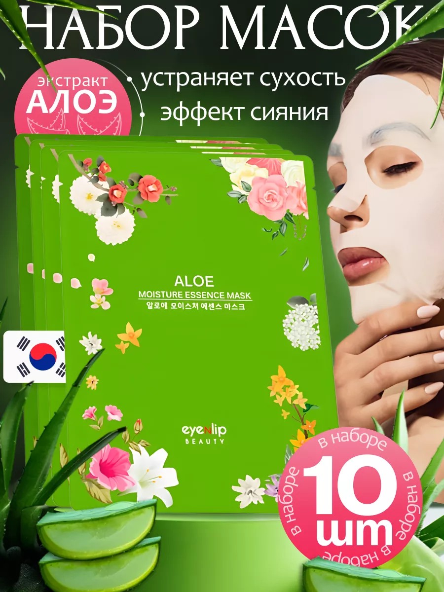 Корейский Набор масок для лица тканевые с экстрактом алоэ, 25 мл *10 шт // EYENLIP ALOE OIL MOISTURE ESSENCE MASK
