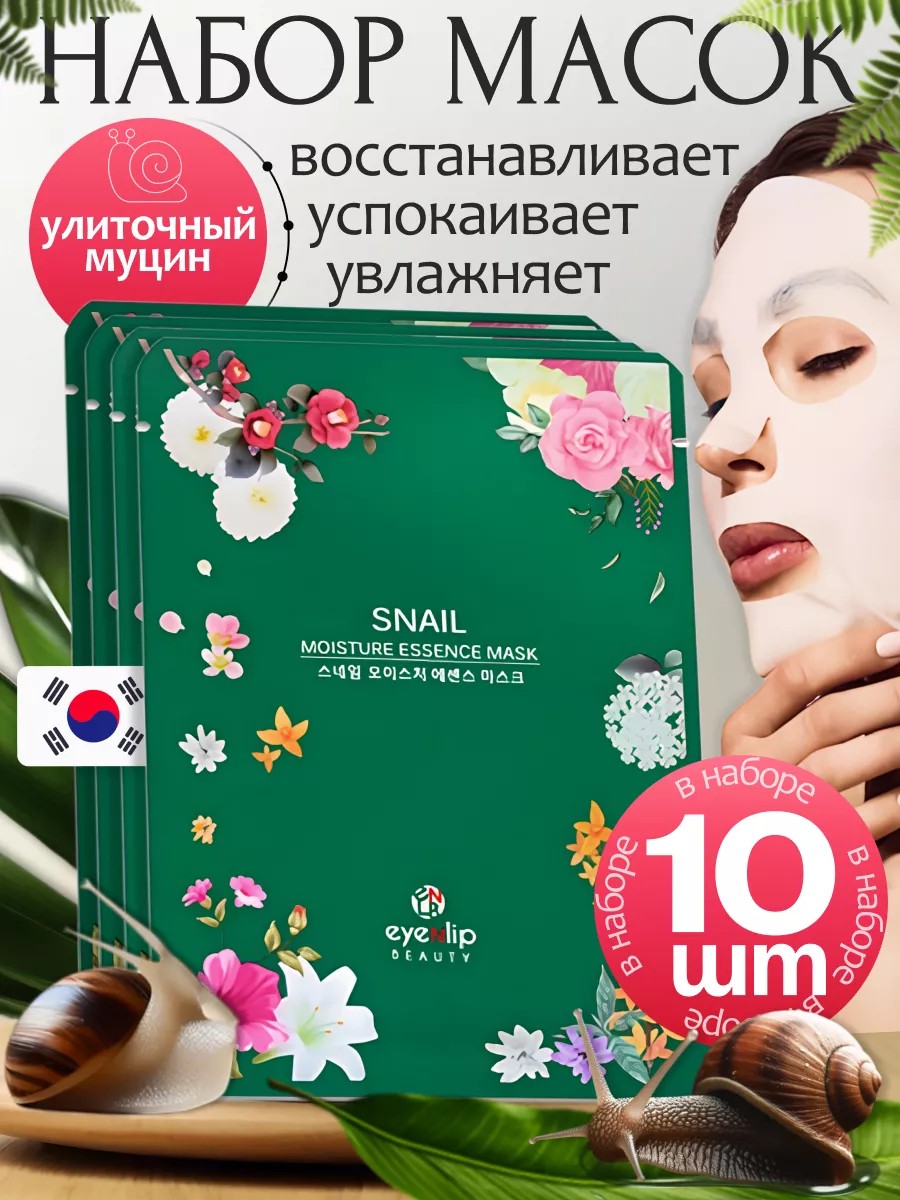 Корейский Набор масок для лица тканевые с муцином улитки, 25 мл *10 шт // EYENLIP SNAIL MOISTURE ESSENCE MASK