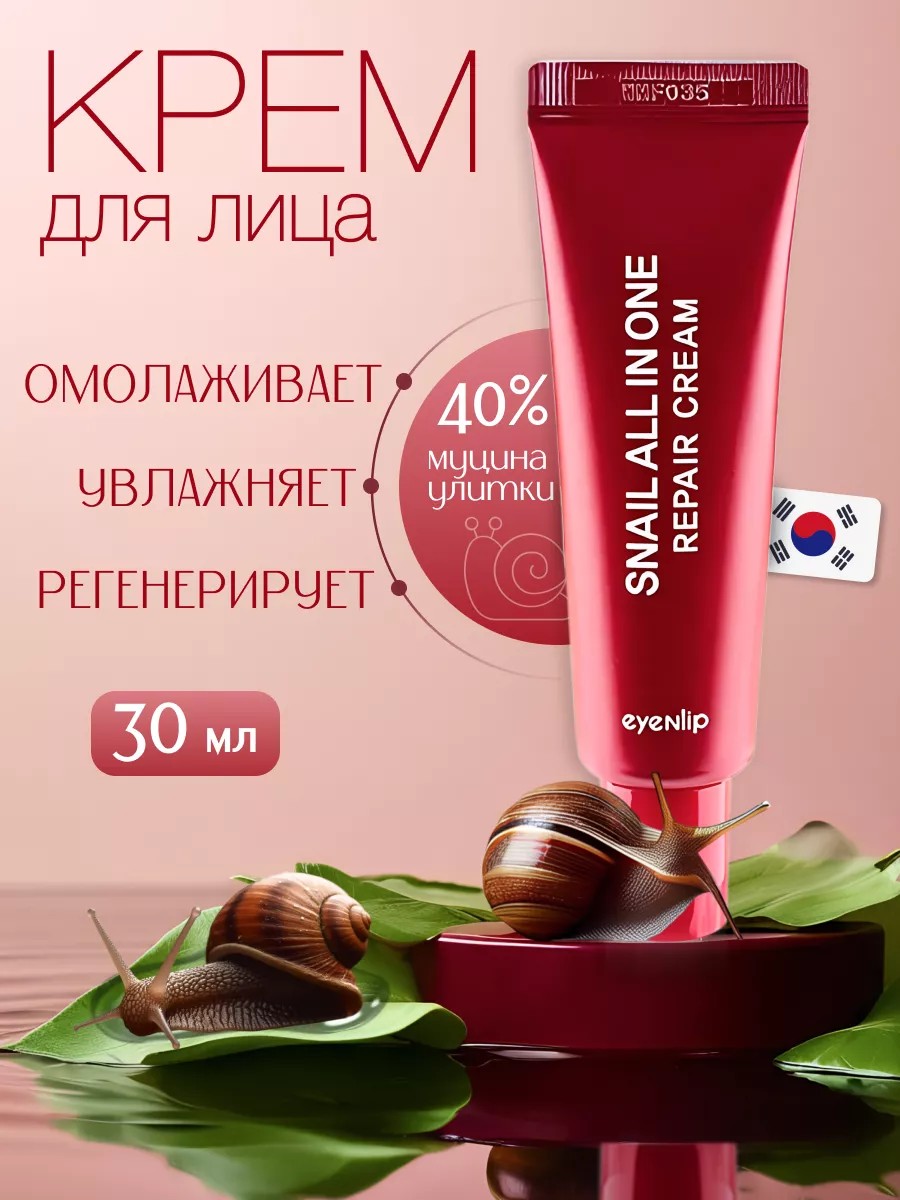 Корейский Крем для лица Eyenlip Beauty Snail All In One Repair Cream Корея с муцином улитки содержит 40% муцина улитки, который оказывает омолаживающее, увлажняющее и регенерирующее действия. Благодаря этому компоненту, крем разглаживает морщины, выравнивает рельеф кожи, улучшает цвет лица, делает кожу более упругой и эластичной.