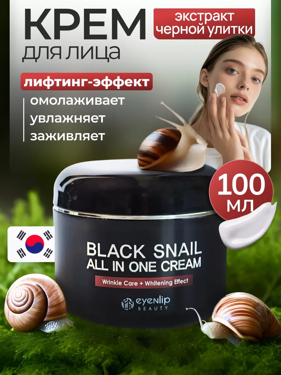 Корейский Крем для лица с экстрактом черной улитки Eyenlip Beauty Black Snail All In One Cream - это увлажняющий крем, который помогает коже справиться с признаками увядания, оказывает лифтинг-эффект, заживляет, подтягивает овал лица и придает ему свежий отдохнувший вид.