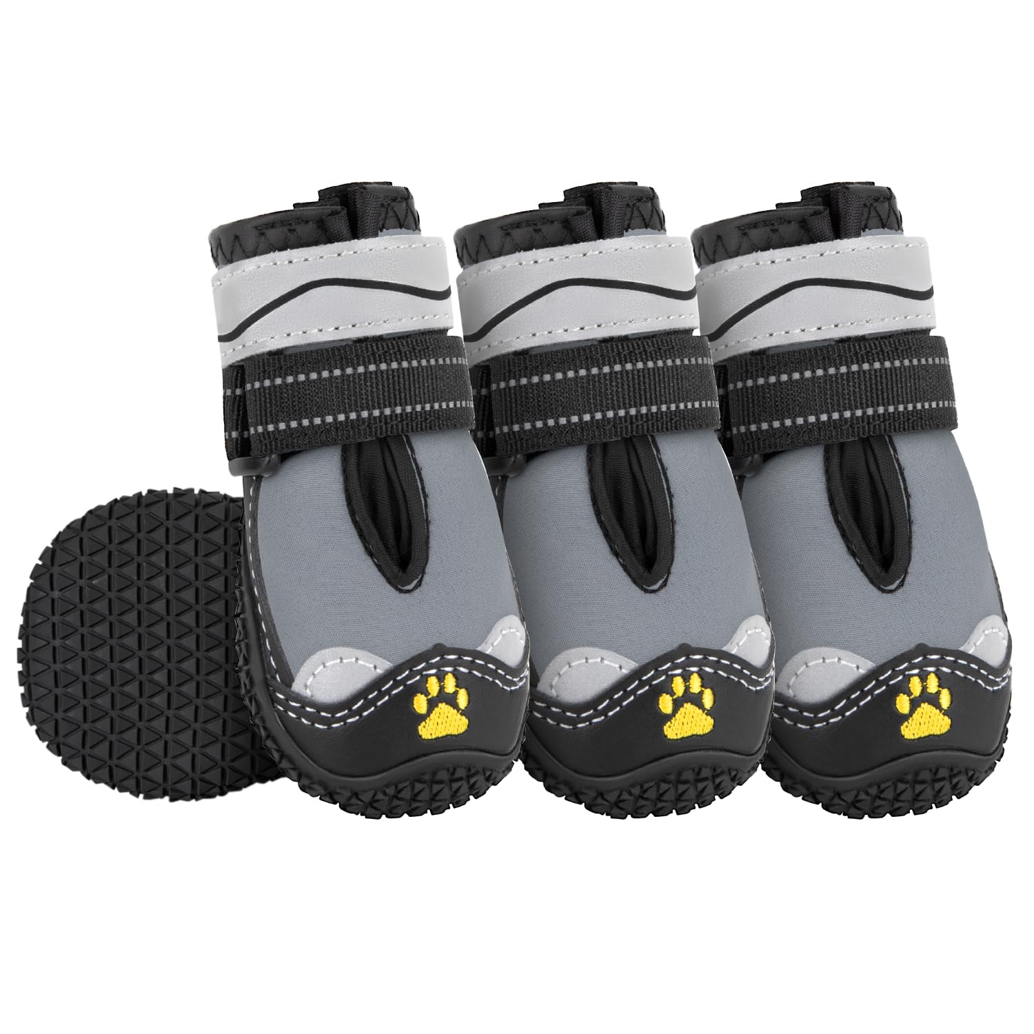 A variety of applicationsThis dog shoe insert is made of soft, thin fleece and is suitable for indoor and outdoor use in autumn and winter.It prevents your dog's claws from damaging your house, vehicle and visitors.It can also effectively protect injured dog paws from licking.You don't have to worry that your dog's paws get dirty or injure when they go outside.Adjustable and safeThese dogs paw protection boots have a large open seam and two adjustable Velcro fasteners that can be adapted to the leg size of their dog for an easy tightness and undressing.Reflecting Velcro fasteners improve visibility and help your dog run safely at night.Water -repellent fabricEyein dog shoes are made of waterproof leather and water -repellent fabric, the upper material is provided with a water -repellent coating, which can easily shake water drops on the upper material and offers good protection against wind and dust.Tip: The waterproof property helps to resist light rain for a short time, but it is not recommended to be used as rain shoes.Non -slip and hard -wearing soleThe non -slip design of the soles ensures high stability and traction so that your dog can move on tiles and sand better and remains stable.The soft rubber soles protect your dog's paws from sharp thorns, hot plasters and rough salt particles on snowy days.Several size optionsThere are 9 sizes (size 0 - 8) to choose from.Our sizes are based on the inner diameter of the shoe, please make sure that you carefully measure the width of your dog's paws and then refer to the size table in the picture.You can choose the right size for your dog so that it feels comfortable.Vielfältige AnwendungenDiese Hundeschuheinlage besteht aus weichem, dünnem Vlies und ist für den Innen- und Außenbereich im Herbst und Winter geeignet. Es verhindert, dass die Krallen Ihres Hundes Ihr Haus, Fahrzeug und Besucher beschädigen. Sie kann auch verletzte Hundepfoten effektiv vor dem Belecken schützen. Sie müssen sich keine Sorgen machen, dass die Pfoten Ihres Hundes schmutzig werden oder sich verletzen, wenn Sie nach draußen gehen. Verstellbar und sicherDiese Hunde pfotenschutzstiefel haben eine große offene Naht und zwei verstellbare Klettverschlüsse, die für ein einfaches An- und Ausziehen an den Beinumfang Ihres Hundes angepasst werden können. Reflektierende Klettverschlüsse verbessern die Sichtbarkeit und helfen Ihrem Hund, nachts sicher zu laufen. Wasserabweisender StoffEyein Hundeschuhe sind aus wasserdichtem Leder und wasserabweisendem Stoff gefertigt, das Obermaterial ist mit einer wasserabweisenden Beschichtung versehen, die Wassertropfen auf dem Obermaterial leicht abschütteln kann und einen guten Schutz vor Wind und Staub bietet. TIPP: Die wasserdichte Eigenschaft hilft, leichten Regen für eine kurze Zeit zu widerstehen, aber es wird nicht empfohlen, als Regenschuhe verwendet werden. Rutschfeste und strapazierfähige SohleDas rutschfeste Design der Sohlen sorgt für eine hohe Stabilität und Traktion, damit Ihr Hund sich auf Fliesen und Sand besser bewegen kann und stabil bleibt. Die weichen Gummisohlen schützen die Pfoten Ihres Hundes vor scharfen Dornen, heißem Pflaster und groben Salzpartikeln an verschneiten Tagen. Mehrere GrößenoptionenEs stehen 9 Größen (Größe 0 - 8) zur Auswahl. Unsere Größen basieren auf dem Innendurchmesser des Schuhs, bitte stellen Sie sicher, dass Sie die Breite der Pfoten Ihres Hundes sorgfältig messen und sich dann auf die Größentabelle im Bild beziehen. Sie können die richtige Größe für Ihren Hund wählen, damit er sich wohl fühlt.Eyein Hundeschuhe Pfotenschutz, 4 Stück Wasserabweisend Hundeschuhe mit Rutschfester Sohle und reflektierendem Klettverschluss für kleine, mittlere und große Hunde, Sport im Freien, Grau, Größe 3 Größe 3: Breite 4.7 cm Q-Grau-Wasserabweisend (4 Stück)