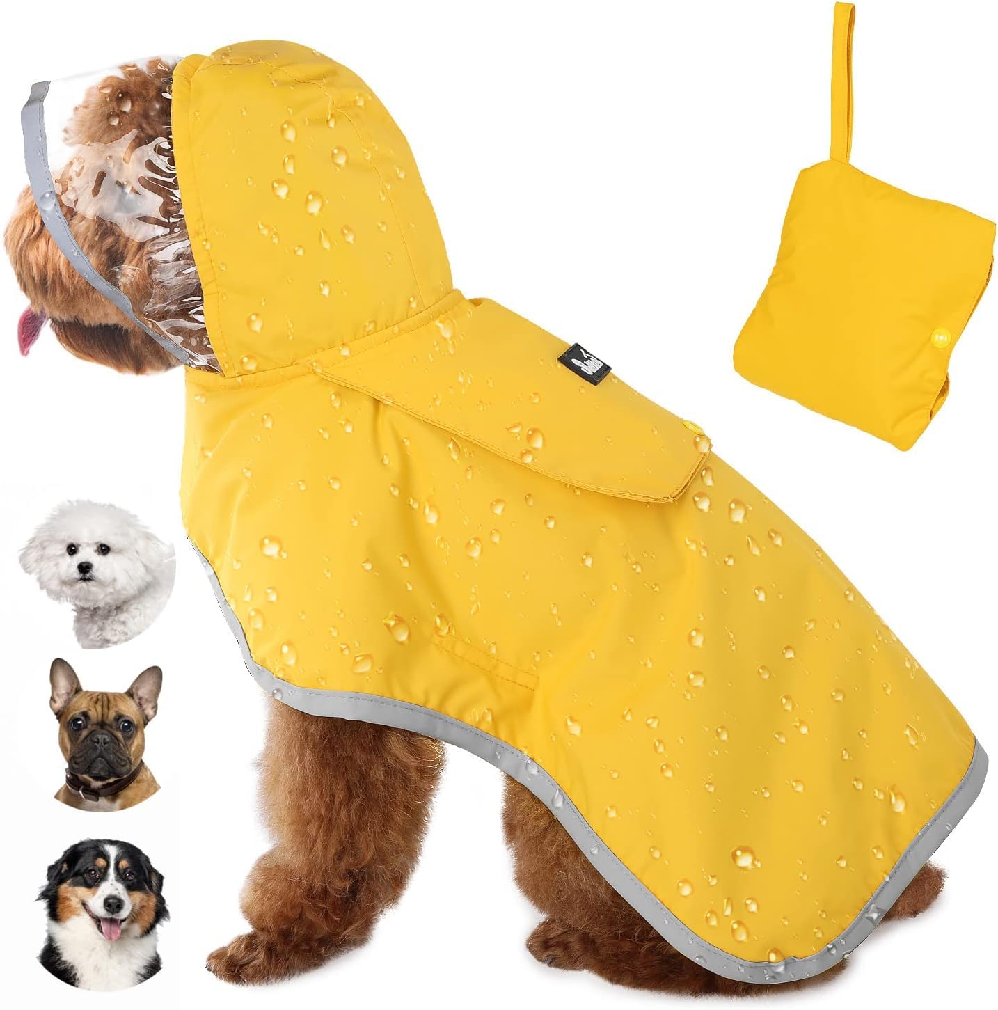 SizeAvailable in 7 sizes from XS to XXXL, suitable for small, medium and large dogs from 2.3 to 40 kg.Note: Please measure the back length, the neck size and the chest size of your dog and refer to the size table before buying.Adjustable VelcroEyein's dog-Mackintosh has adjustable Velcro fasteners on the neck and stomach to offer most dogs a comfortable and safe fit.Note: The elastic tail strap should only be used for sizes L, XL, XXL and XXXL to ensure a better fit.POORE POCKING DESIGNThis handy, light raincoat for dogs can be easily folded and stowed away in the car or when traveling.When it rains, the bags can cover the holes for the cable hooks underneath to prevent rain from escaping.Unique hat designThe transparent brim can protect your dog from wind and rain without affecting the view of your pet.Reflecting clamping edges increase the visibility to protect your pets.Waterproof materialThis hundred coat consists of 100 waterproof nylon fabric on the outer layer and breathable mesh on the inner layer.It ensures that your pet remains comfortable and dry even in the most adverse weather conditions.GrößeErhältlich in 7 Größen von XS bis XXXL, geeignet für kleine, mittlere und große Hunde von 2,3 bis 40 kg. Hinweis: Bitte messen Sie die Rückenlänge, den Nackenumfang und den Brustumfang Ihres Hundes und beziehen Sie sich vor dem Kauf auf die Größentabelle. Verstellbarer KlettverschlussEyein's Hunde-Mackintosh hat verstellbare Klettverschlüsse am Hals und am Bauch, um den meisten Hunden einen bequemen und sicheren Sitz zu bieten. Hinweis: Der elastische Schwanzriemen sollte nur bei den Größen L, XL, XXL und XXXL verwendet werden, um eine bessere Passform zu gewährleisten. Tragbares TaschendesignDieser handliche, leichte Regenmantel für Hunde lässt sich einfach zusammenfalten und im Auto oder auf Reisen verstauen. Wenn es regnet, können die Taschen die Löcher für die Seilhaken darunter abdecken, um zu verhindern, dass Regen austritt. Einzigartiges HutdesignDie transparente Krempe kann Ihren Hund vor Wind und Regen schützen, ohne die Sicht Ihres Haustieres zu beeinträchtigen. Reflektierende Krempenränder erhöhen die Sichtbarkeit, um Ihre Haustiere zu schützen. Wasserdichtes MaterialDieser Hunderegenmantel besteht aus 100 wasserdichtem Nylongewebe auf der Außenschicht und atmungsaktivem Mesh auf der Innenschicht. Sie sorgt dafür, dass Ihr Haustier auch bei widrigsten Wetterbedingungen bequem und trocken bleibt.Eyein Wasserdichter Hunderegenmantel, Regenmantel für Kleiner Hunde mit weichem Futter und Kapuze, Verstellbare Hunderegenjacke mit reflektierenden Streifen für Spaziergäng, Winddicht und leicht, S