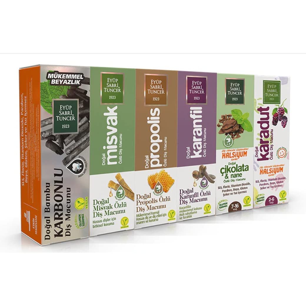 Eyup Sabri Tuncer toothpaste series with natural ingredients, developed with reliable, perfect formulas and precision, is now in 7,5ml packaging for everyone to try! Contained in the box with specially developed formulas that do not contain fluoride, SLS, Titanium Dioxide, Paraben, Gluten, Coloring, Salt, and Sugar. The toothpaste series with natural ingredients with activated carbon, propolis, misvak, clove, chocolate, and mint for teenagers and black mulberry extracts for children will be appreciated by everyone who uses it.