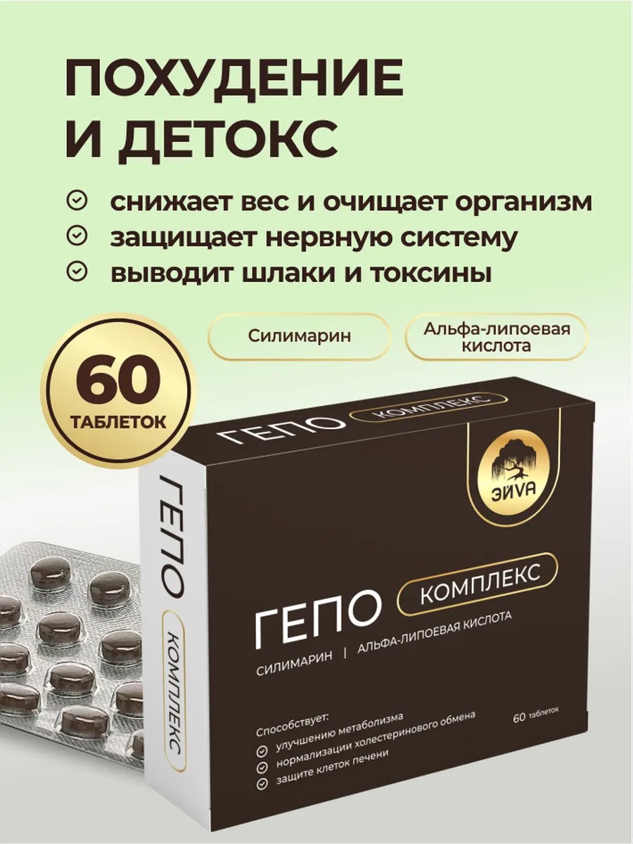 Гепо комплекс от Российского производителя ЭЙVА – это биологическая добавка для поддержания организма и активного детокса. В составе присутствует силимарин, который известен как антиоксидант и помогает очищению организма, а также альфа-липоевая кислота (lipoic acid/alpha lipoic), способствующая сбросу веса и улучшению состояния кожи. Продукт подходит для тех, кто заботится о молодости и здоровье, хочет добавить в свою пищу элементы детокса или стремится к снижению веса. Биодобавка разработана для поддержки обмена веществ, участвует в процессах вывода токсинов и способствует нормализации функций печени.Активные компоненты комплекса включают мультивитамины и микрокристаллический целлюлозный наполнитель, что делает его удобным элементом ежедневного рациона для атлетов или тех, кто придерживается здорового образа жизни. Продукт может быть полезен при программах похудения или восстановлении после нагрузок. Благодаря своему арсеналу ингредиентов, средство мягко поддерживает процессы очищения и обновления клеток.