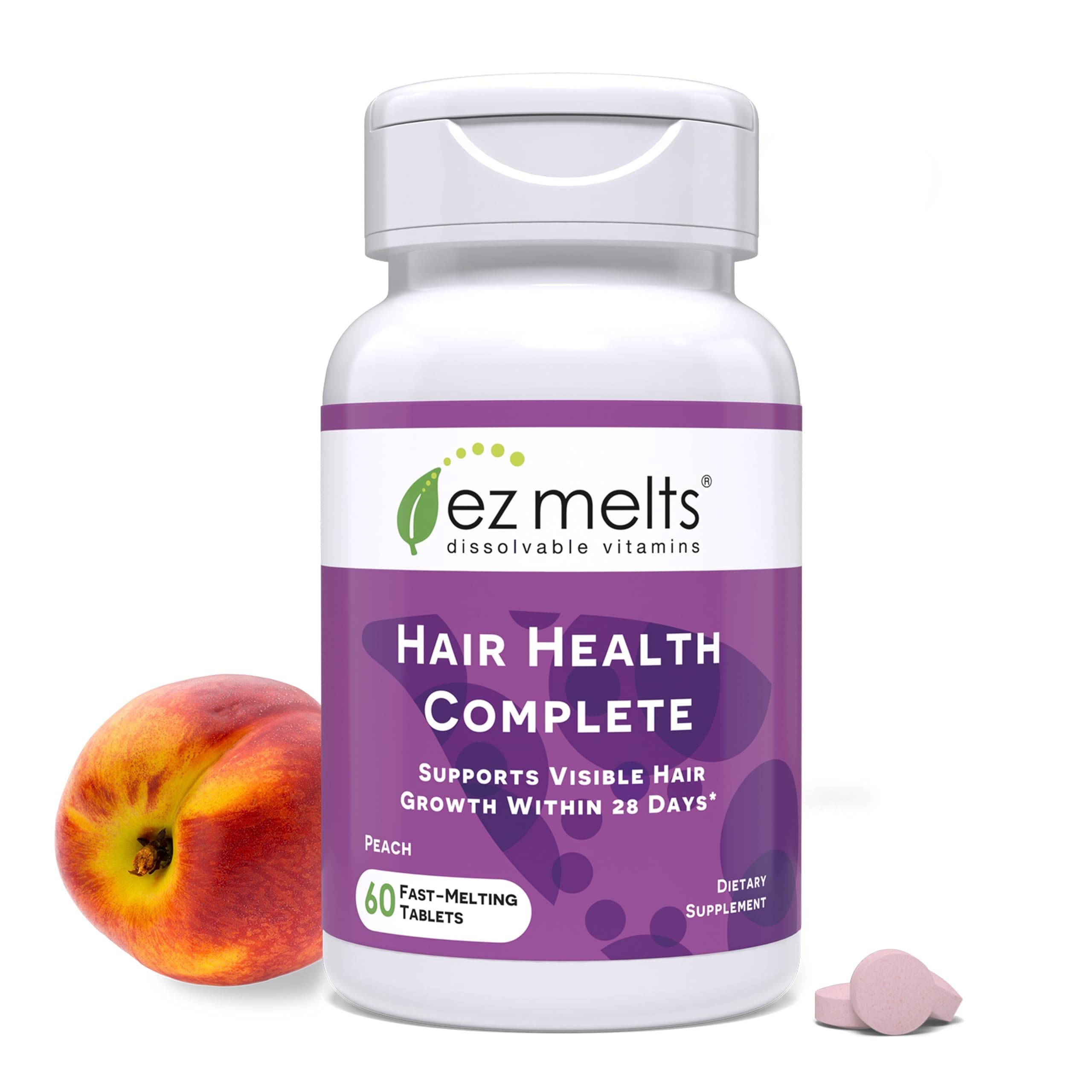 About EZ Melts: Our mission is to simplify your wellness routine with effective, easy-to-take vitamins you'll actually enjoy. Fast-Melting Tablets: Sugar-free nutrients for your hair that dissolve quickly in your mouth, with no water needed, making daily use simple, smooth, and stress-free. Complete Hair Supplement: Also includes PQQ, bamboo shoot silica, and apigenin to support scalp health and shiny hair . Advanced Hair Care Blend: Features AnaGain Nu and biotin to provide support for visibly fuller hair within 28 days . Hair Supplement: EZ Melts Hair Health Complete supports healthy hair, including energy, strength, scalp circulation, and follicle support, with essential nutrients .