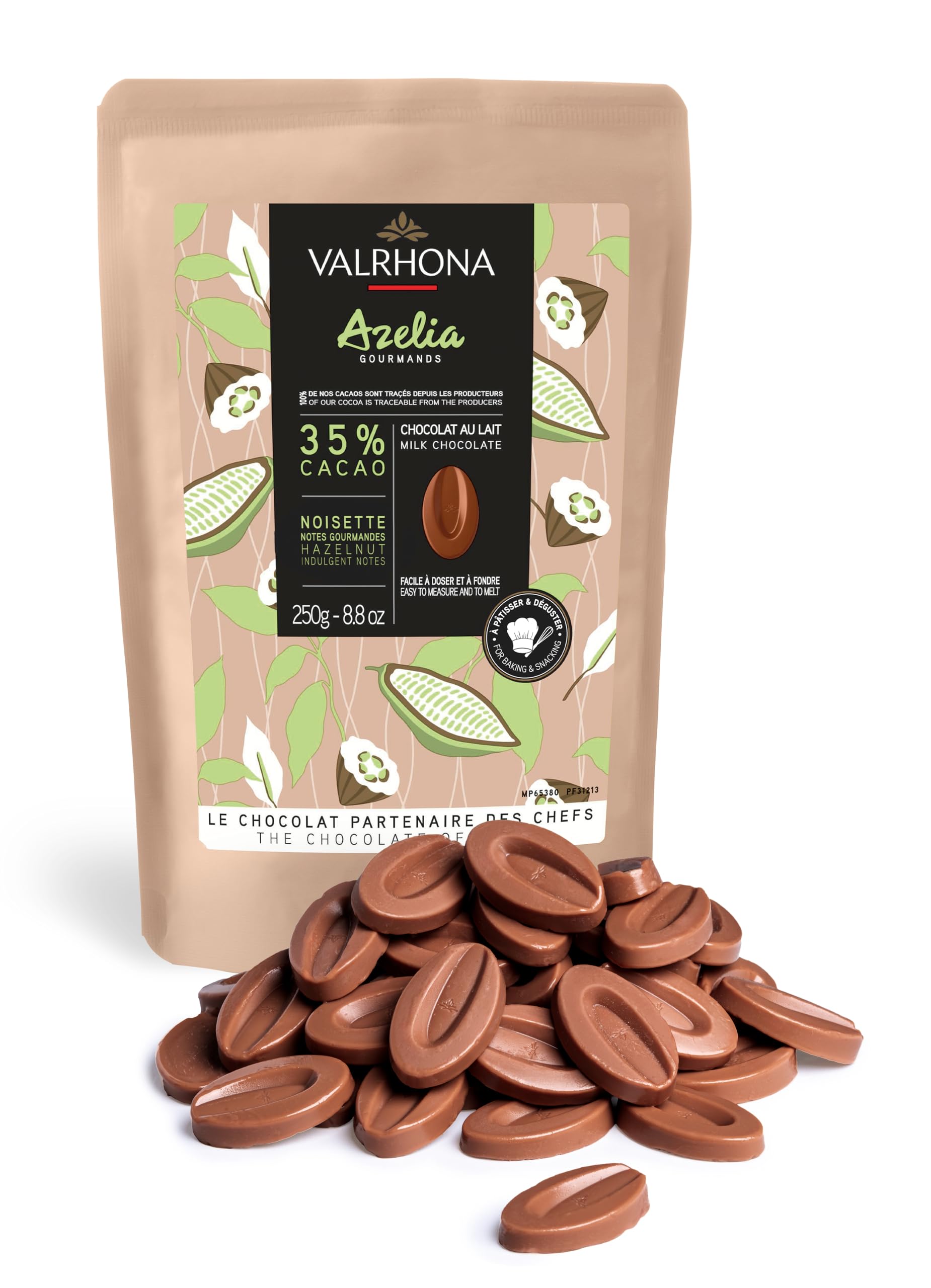 Azelia Cocoa Bean Bag - Couverture Chocolate: Its enticing aroma, barely released, invites you to taste. Notes of chocolate and roasted hazelnuts combine elegantly on the palate. The beauty of Azelia lies in offering intense indulgence while remaining light on the palate. May contain traces of milk and nuts. Weight: 250g Ingredients: Sugar, cocoa butter, whole milk powder, hazelnuts 13.6 , cocoa beans, dried skimmed milk, emulsifier: sunflower lecithin, natural vanilla extract.Special chocolate for hazelnut lovers (K triangle - dairy). Easy to melt. For delicious frostings, brownies, and cakes. Simply use a small portion in place of the chocolate in your recipe. Our commitment to sustainability: 100 of our cocoa is traceable back to the producers. B-Corp certified. By choosing VALRHONA products, you are helping to create a more sustainable cocoa industry. High-quality ingredients: the finest and only selection of cocoa and hazelnuts. No artificial flavors. French milk chocolate and hazelnut slices (BEVES): perfect size. Easy to slice, use, and melt thanks to its unique shape, specially designed for baking, slicing, and pushing. Wonderful and unique taste. Azélia 35 milk chocolate. Find a subtle balance of chocolate and roasted nuts with this warm milk chocolate, perfect for baking, drinking, or simply dribbling.Description du produit Sac de Fèves Azelia - Chocolat de couverture : Son odeur gourmande, à peine dévoilée, invite à la dégustation. Les notes de chocolats et de noisettes grillées se conjuguent en bouche avec élégance. Toute la beauté d'Azélia est d'offrir une extrême gourmandise tout en restant léger à la dégustation. Trace éventuelle de lait et fruits à coque. Poids : 250 g Ingrédients Sucre, beurre de cacao, lait entier en poudre, noisettes 13,6 , fèves de cacao, lait écrémé séché, émulsifiant : lécithine de tournesol, extrait naturel de vanille.Chocolat spécial pour les amateurs de noisette (triangle K - laitiers). Facile à fondre. Pour de délicieux glaçages, brownies et gâteaux. Il suffit d'utiliser une petite portion à la place du chocolat de votre recette. Notre engagement envers la durabilité : 100 de notre cacao est traçable aux fabricants. Certifié B-Corp. Grâce au choix des produits VALRHONA, vous contribuez à créer un secteur du cacao plus durable. Ingrédients de haute qualité : la meilleure et unique sélection de cacao et de noisettes. Sans arômes artificiels. Tranches de chocolat français au lait et noisette (FEVES) : taille parfaite. Facile à grimper, utiliser et fondre grâce à sa forme unique, spécialement conçu pour cuire, tailler et pousser. Goût merveilleux et unique. Azélia 35 chocolat au lait. Trouvez un subtil équilibre de chocolat et de noix grillées avec ce chocolat chaud au lait marron parfait pour cuire, boire ou tout simplement griffonner.Fèves Chocolat Azelia Pâtissier 35 - 250g