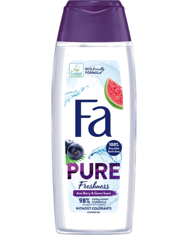 Fa Pure Fresh Shower Gel Acai Berry Guava scent - refreshing and nourishing, for a clean, energetic skin experience bursting with freshness with Fa Pure Fresh Shower Gel Acai Berry Guava Scent. This scathing shower gel is infused with the vibrant scents of acai berry and guava, providing a refreshing and energizing experience every time you shower. The gentle formula cleanses and nourishes the skin, leaving it feeling fresh, soft and beautifully perfumed all day long.Infused with the refreshing scent of acai berry and guava, this shower gel offers a tropical, fruity scent that revitalizes your senses. The gentle formula cleanses and nourishes your skin, leaving it soft, supple and hydrated after each use. Creates a rich cleanser that thoroughly cleanses and provides a refreshing, spa-like shower experience. Perfect for daily use, it keeps your skin fresh, energized and revitalized all day long. Dermatologically tested, this shower gel is suitable for all skin types, ensuring gentle cleansing without irritation.Fa Pure Freshness Shower Gel Acai Berry Guava Scent, Pck of 3, 250 ml Fa Puur frisse douchegel Acai Berry Guava geur - verfrissend en voedend, voor een schone, energieke huidbeleving van een barst van frisheid met Fa Pure Fresh Shower Gel Acai Berry Guava Scent. Deze vernietigende douchegel is geïnfuseerd met de levendige geuren van acai berry en guava, biedt elke keer dat je douchen een verfrissende en energieke ervaring biedt. De zachte formule reinigt en voedt de huid, waardoor het de hele dag fris, zacht en prachtig geparfumeerd voelt.Gedrenkt met de verfrissende geur van acai berry en guava, biedt deze douchegel een tropische, fruitige geur die je zintuigen revitaliseert. De zachte formule reinigt en voedt je huid, laat hem zacht, soepel en gehydrateerd na elk gebruik. Creëert een rijke reiniger die grondig reinigt en biedt een verfrissende, spa-achtige douche-ervaring. Perfect voor dagelijks gebruik, het houdt je huid de hele dag fris, energiek en gerevitaliseerd. Dermatologisch getest, deze douchegel is geschikt voor alle huidtypes, wat zorgt voor een zachte reiniging zonder irritatie.