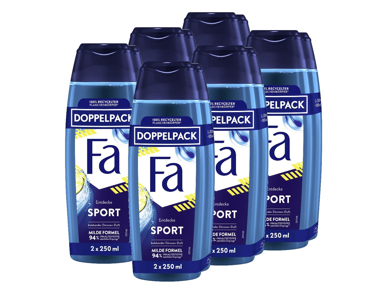 Be smarter. Save water. Recycle - Whether it's taking shorter showers or turning off water when brushing your teeth, let's start by reducing water consumption in the bathroom. Fresh as never before: dive into the world of Fa and discover our shower gels and shower gels with exciting scents. Refresh yourself every day with something fantastic. The new Fa – discover the new Fa shower bath with 100 recycled bottle (excluding cap) and 94 ingredients of natural origin (including 84 water). Exciting scent: the shower gel with a vitalizing, fresh scent of green citrus is ideal for daily body care. Fa Shower Gel: dive into the world of Fa and enjoy the vitalizing, fresh scent of green citrus.FA Douchegel Sport, verpakking van 6 stuks (6 x 2 x 250 ml)Wees slimmer. Bespaar water. Recycle - Of het nu gaat om korter douchen of het afzetten van water bij het tandenpoetsen, laten we beginnen met het verminderen van het waterverbruik in de badkamer. Fris als nooit tevoren: duik in de wereld van Fa en ontdek onze douchegels en douchegels met spannende geuren. Verfris je elke dag met iets fantastisch. De nieuwe Fa – ontdek het nieuwe Fa douchebad met 100 gerecyclede fles (exclusief dop) en 94 ingrediënten van natuurlijke oorsprong (inclusief 84 water). Spannende geur: de douchegel met vitaliserende, frisse geur van groene citru is ideaal voor de dagelijkse lichaamsverzorging. Fa Douchegel: duik in de wereld van Fa en geniet van de vitaliserende, frisse geur van groene citrus.