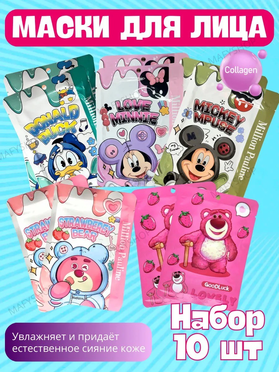 Тканевые маски для лица с героями Disney станут настоящей находкой для всех поклонниц Микки Мауса, Дональда Дага и медвежонка Лотсо! Уникальный набор включает в себя 10 штук увлажняющих и очищающих масок с коллагеном, каждая из которых порадует вас своим милым дизайном с изображениями медведя, утки и мышонка. Набор масок с коллагеном обеспечит вашей коже максимальный уход. Коллаген — это важный элемент, который способствует упругости и эластичности кожи. Себорегулирующая маска улучшает внешний вид кожи, сужает поры, делая её более гладкой и ровной. Подходит для всех типов кожи, включая жирную, станет вашим надежным помощником в борьбе с черными точками и другими несовершенствами. Мягкая текстура и насыщенный сыворотка с коллагеном обеспечивают увлажнение, питание и очищение. Вы сможете насладиться ощущением свежести и комфорта, а также заметить, как ваша кожа становится более сияющей и здоровой. Набор масок c микки маусом — это идеальное решение для тех, кто хочет побаловать себя и подарить своей коже то, что ей действительно нужно. Косметический набор является отличным подарком для девушек и женщин. Его можно смело презентовать на день рождения, 8 марта или просто так, чтобы порадовать близкого человека. Подойдет как для подростков, так и для более зрелых дам, которые ценят качественную уходовую косметику. Если вы ищете идеальный бьюти бокс для девочек с Минни Маус и друзьями, наши тканевые маски для лица — это именно то, что вам нужно. Легкие в использовании и прекрасно вписываются в любой ритуал ухода за лицом. Нанесите маску на очищенную кожу, расслабьтесь на 20 минут и позвольте активным ингредиентам делать своё дело. После использования ваша кожа оживляется и становится более ухоженной. Маски collagen станут вашим верным спутником в уходе за лицом, а их милый дизайн добавит радости в вашу повседневную рутину. Закажите набор масок уже сегодня и откройте для себя мир китайской косметики, который подарит вашей коже здоровье и красоту!