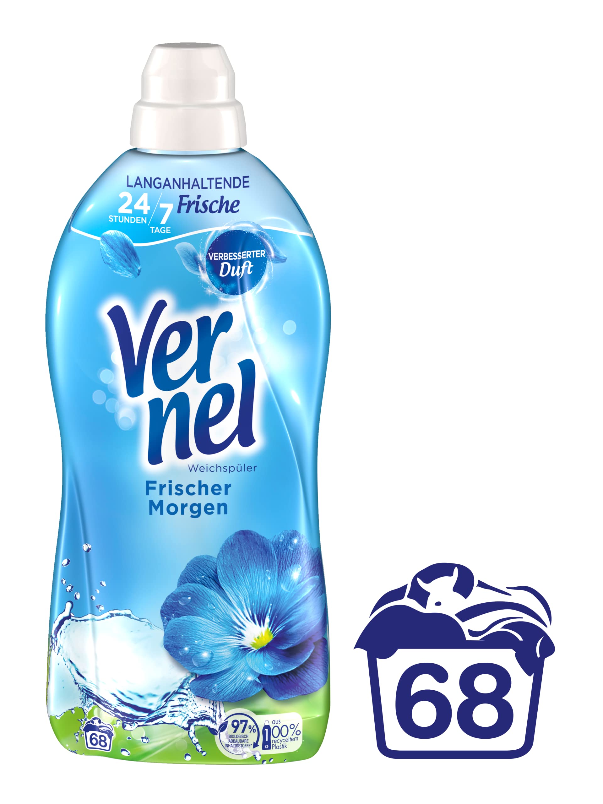Vernel fabric softener Fresh Morning - Long-lasting fragrance experience for 24 hours & 7 days Enjoy the extraordinary scent of a fresh morning that follows you every moment for 24 hours and up to 7 days thanks to its unique, long-lasting fragrance. Vernel Fresh Morning takes you on a journey of incredible softness and an unforgettable fragrance that feels like a walk on a fresh morning. The laundry care formula is dermatologically approved and reduces static. Your favorite clothes are cared for every fiber and can be ironed more smoothly. At the same time, Vernel Fabric Softener Fresh Morning contains 97% biodegradable ingredients and comes in a bottle made from 100% recycled plastic. The plastic film can be easily separated during the recycling process so that the bottle can be fully recycled if a recycling stream is available. A detailed look at the product features: * Long-lasting effect for up to 7 days * Fresh morning fragrance * Skin compatibility dermatologically confirmed * Formula with fiber protection & anti-static * Makes ironing easier * Environmentally friendly formula Usage: Pour the fabric softener into the cap and add to the fabric softener compartment in the rinse chamber of the washing machine. Dosage: * 4-5 kg of laundry: 25 ml (35 ml for extra freshness and softness) * 6-8 kg wash: 55 ml for extra freshness and softness The Vernel brand Dive into the wonderful world of Vernel fragrances and experience your own personal feel-good moment. Feel incredible softness and a long-lasting "like freshly washed" fragrance. Vernel - The fragrance to fall in love with!