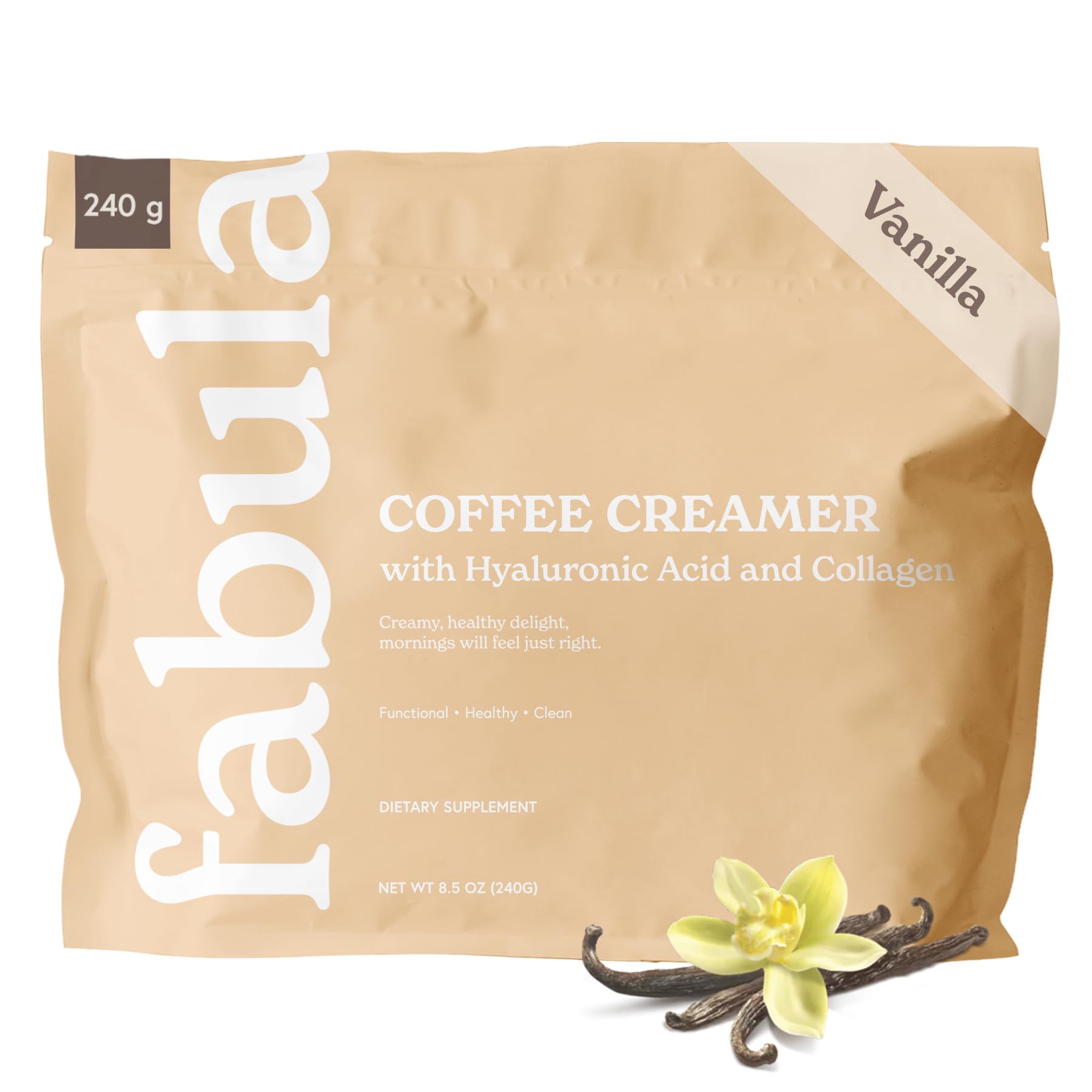 Indulge in Fabula's Vanilla Creamer infused with Collagen and Hyaluronic Acid for health and ageless beauty in every sip. This 240g creamer contains collagen to support gut lining health and elastin firming. It has a non-spike energy formula and is free of spoilers. Enjoy the creamy, velvety texture of this vanilla flavored creamer. The 8 inch tall x 3.4 inch wide box contains 240 grams of creamer.