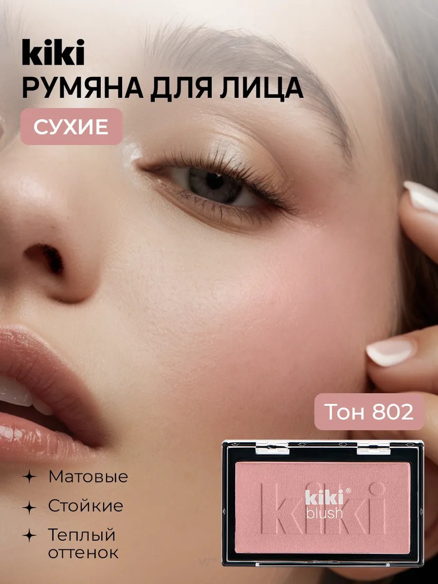Kiki Blush in shade 802 is a natural, morning-fresh shade that gives the face a radiant, rested look. This matte blush combines rich, natural color with easy application and a long-lasting formula. This delicate, luminous flush will conceal signs of fatigue and accentuate the graceful contours of the face, making it an essential step in contouring and sculpting. The product applies evenly, glides on effortlessly, and creates a natural finish that lasts all day. The color intensity can be customized from weightless to intense, depending on the amount applied. Kiki's powder blush is designed to apply beautifully on bare skin or as a finishing touch after a full face of makeup. To achieve a high-quality effect and beautiful blending, you don't need a brush; you can even use your fingers. This caramel-beige blush is perfect for women of all complexions. The compact blush fits easily in even a small purse for a refreshing touch throughout the day. Kiki women's makeup is your indispensable companion for creating a unique style and look! The brand's delicate shades are perfect for girls and teens. It makes a great gift for your beloved women, sisters, daughters, mothers, and girlfriends, for birthdays and other holidays. A perfect gift for Mother's Day, Teacher's Day, and Educator's Day.