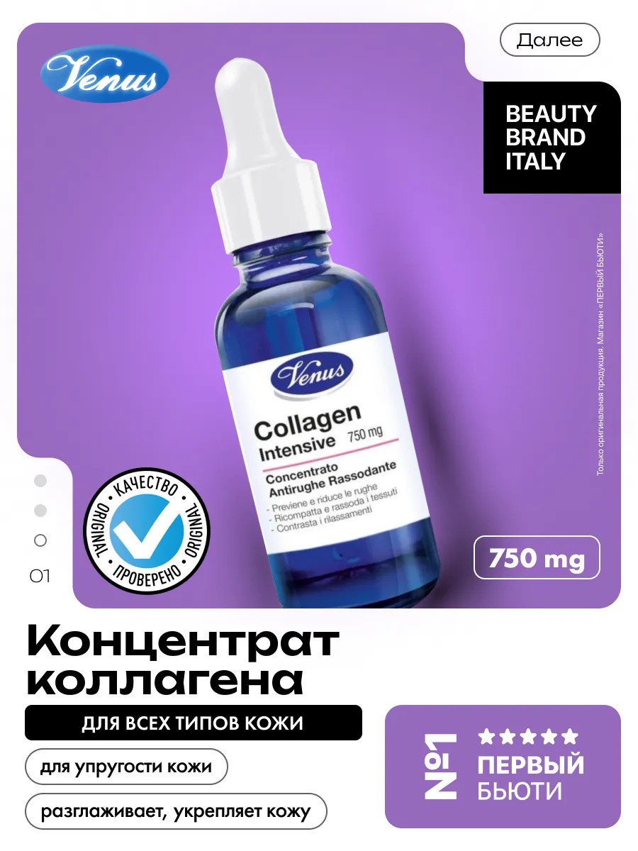 VЕNUS Концентрат коллагена для лица для упругости кожи, 30 мл. Концентрат для лица содержит 750 мг чистого коллагена. Предупреждает возрастные изменения, разглаживает, укрепляет кожу, повышая ее упругость. Рекомендуется использовать как самостоятельное средство в качестве активной процедуры для кожи, потерявшей упругость с выраженными возрастными изменениями. Или наносить в комплексе с ежедневным уходом для повышения его эффективности и создания «индивидуального ухода» с учетом потребностей кожи,возраста и сезона.