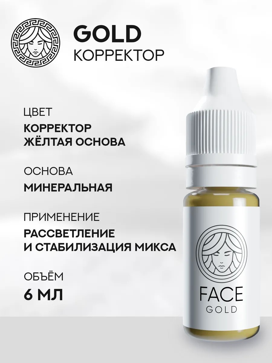 Face GOLD. Минеральный пигмент для перманентного макияжа бровей.Корректор на жёлтой основе. Используется для рассветления основного оттенка и стабилизации микса. Состав: aqua, glycerin, pigments CI: 77492, hamamelis extract, panax ginseng root extract. Минеральная линия - это минеральные пигменты. Они будут укладывать не так быстро, как органика и гибриды, при этом давать натуральные, мягкие, естественные остатки. Остаток 50-70%. Минералы из всех линий быстрее всего выходят из кожи в ноль, равномерно осветляясь, не уходя в серость за счет оптимально подобранной формулы