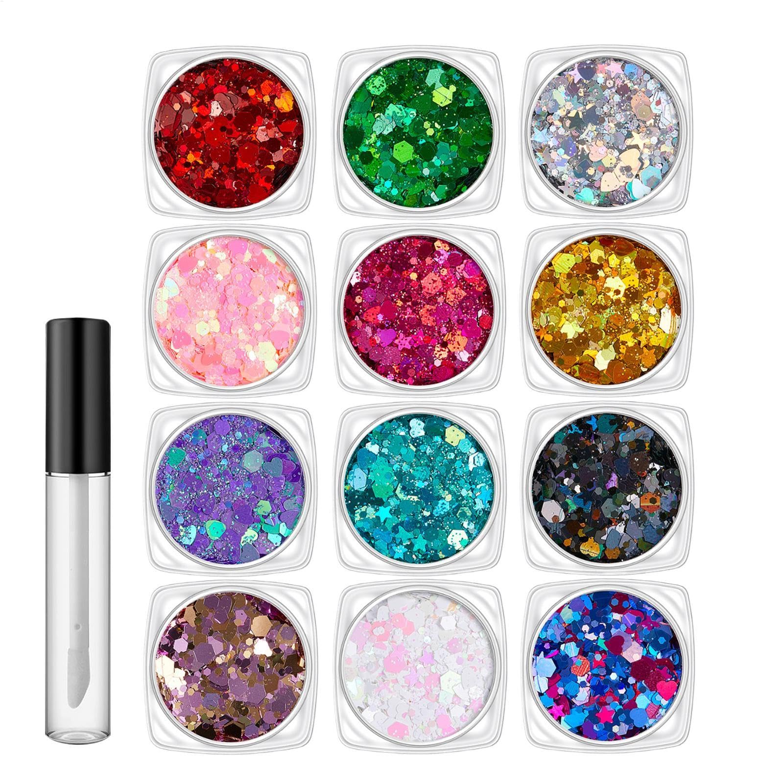 Simply use: Mix versatile glitter with clear gel mediums for more creative options, from jewelry decorating to adding a touch of charm to your tablecloths. Widely used: Take your charm to the next level with this glitter, versatile for parties, celebrations, and special events. Safe for face, body, nails, and hair, it's a dazzling must-have. Safe to use: Skin-friendly glitter and durable adhesive make application large and luminous effortless simply rinse with water afterward. Luminous body glitter: Absorbs light to create unique effects in the dark and a special glow under UV black light, helping you stand out with a luminous touch. Eye-catching design: Turn heads at any event with our vibrant glitter set in 12 colors, featuring fun hexagonal, star, and heart-shaped glitter and a quick-drying adhesive for your body painting needs.