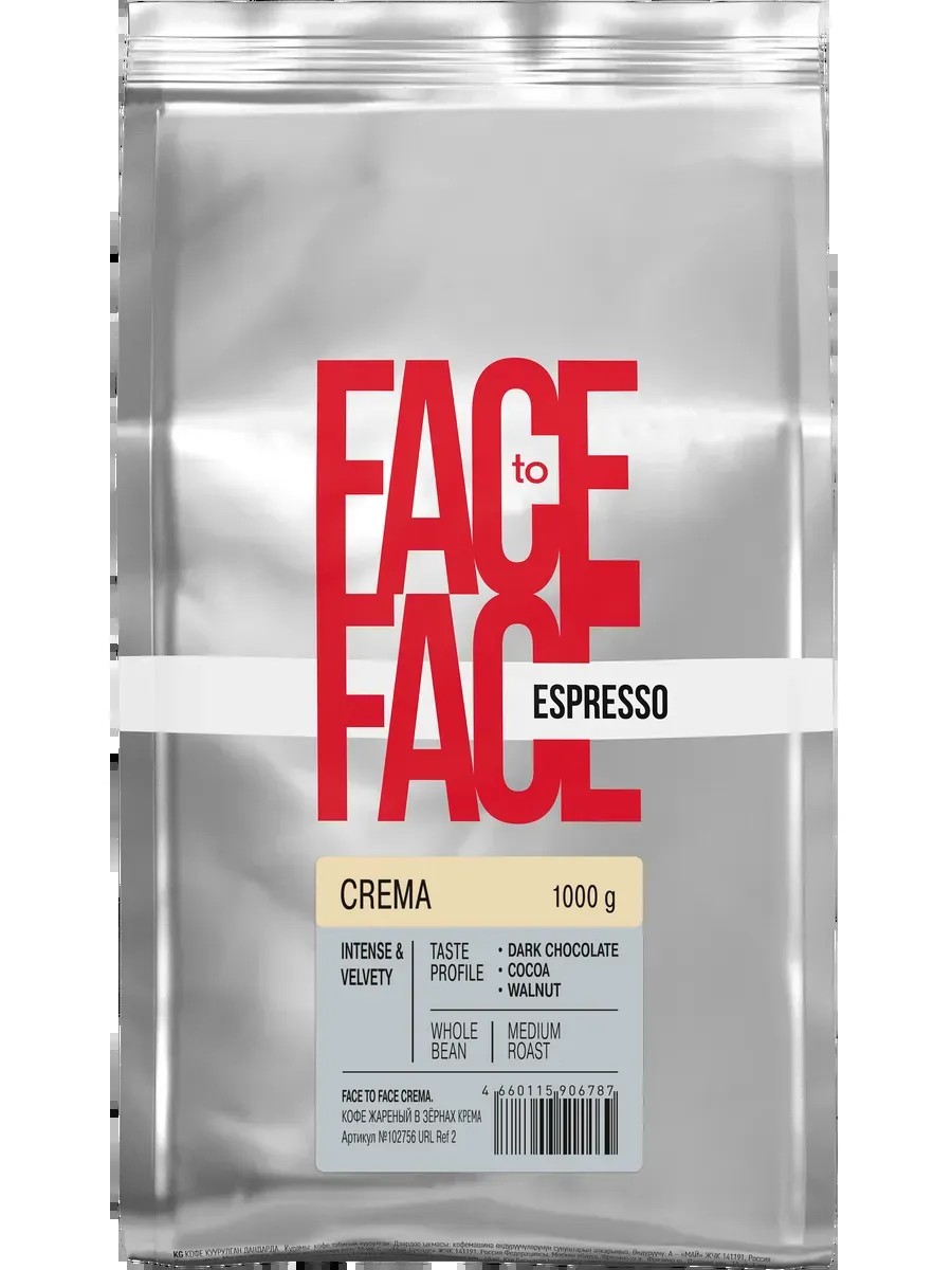 Face to Face Кофе в зернах Crema, 1 кг. Предназначен для любителей насыщенных кофейных и кофейно-молочных напитков. Обладает богатым насыщенным вкусом, плотной бархатистой текстурой, напоминающей горячий шоколад, и длительным приятным послевкусием.