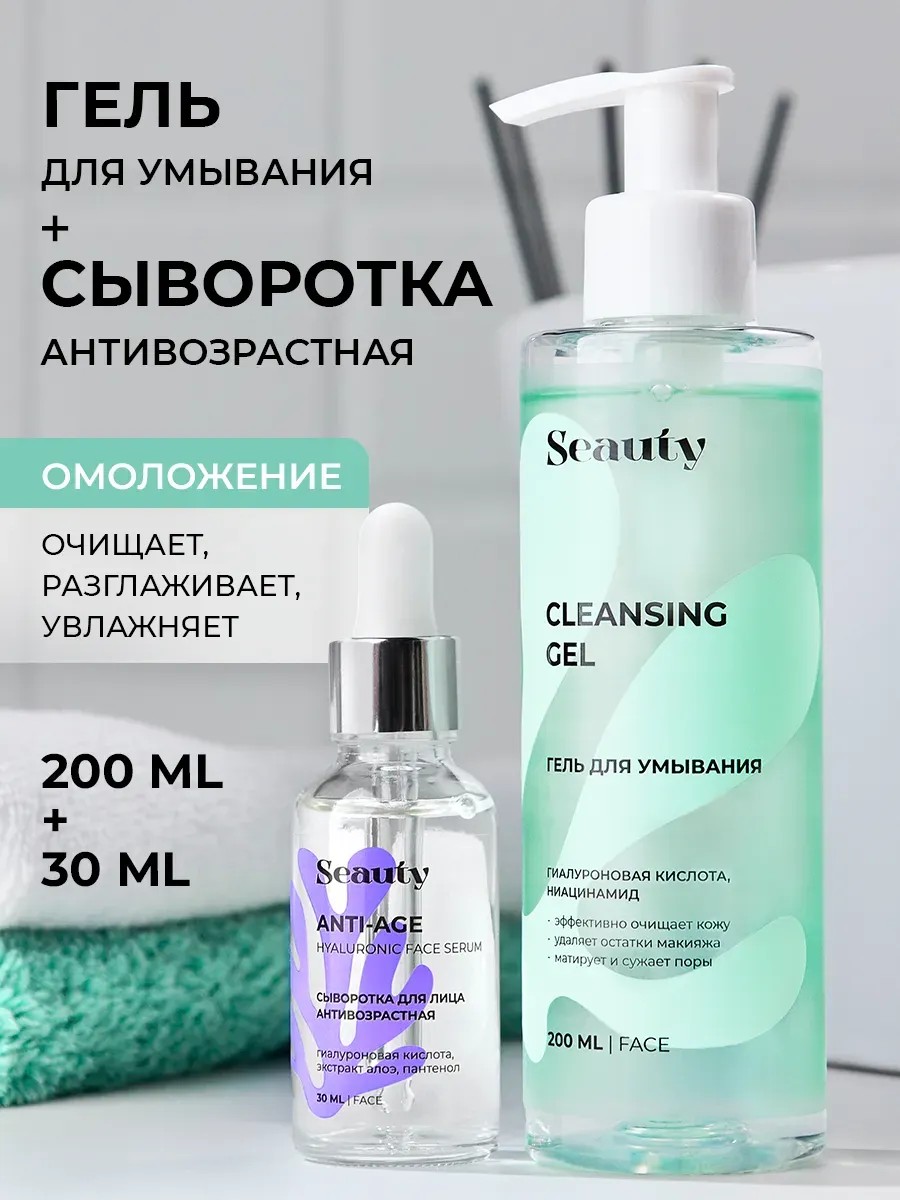 Набор профессиональной косметики для лица от Seauty обеспечит вашей коже глубокое очищение, увлажнение, ровный тон и гладкость. Гель для умывания – это профессиональное средство для очищения лица. Благодаря своему натуральному составу, оно бережно удаляет загрязнения и остатки макияжа. Гиалуроновая кислота для лица гарантирует интенсивное увлажнение, восстанавливает упругость и эластичность кожи. Ниацинамид для лица разглаживает мелкие морщинки и успокаивает раздражения. Средство от прыщей и черных точек содержит экстракт льна, который обладает успокаивающими и противовоспалительными свойствами. Питательный и очищающий гель с кислотами для сухой и проблемной, жирной и нормальной кожи бережно очистит вашу кожу от макияжа. Сыворотка с гиалуроновой кислотой и коллагеном окажет омолаживающее действие. Гиалуроновая кислота и экстракты алое и овса глубоко увлажняют. Антивозрастная сыворотка борется с преждевременным старением кожи. Умывашка для лица и омолаживающая сыворотка обеспечат качественный уход за лицом для всех типов кожи. Гель предотвращает появление угрей и черных точек на носу, делает вашу кожу гладкой и сияющей, смягчая последствия постакне. Каждый элемент этого косметического средства для ухода за лицом работает в гармонии. Умывашка для лица подходит для ежедневного использования, делая процесс очищения от загрязнений, остатков макияжа с глаз и гидрофильного масла простым и приятным. Очищающий гель для умывания обеспечивает глубокую очистку без ощущения сухости. Гель для снятия макияжа более деликатно очищает жирную кожу. Профессиональная формула сыворотки с collagen питает и увлажняет кожу. Ровно ложится под базу макияжа. Обеспечивает безупречное омоложение и увлажнение. Набор будет идеальным дополнением в подарок для женщин и подростков на любой праздник: День рождения и 8 марта, Рождество и Новый год, День матери и 14 февраля. Красота и здоровье кожи круглый год вместе с женскими наборами профессиональной косметики от Seauty.