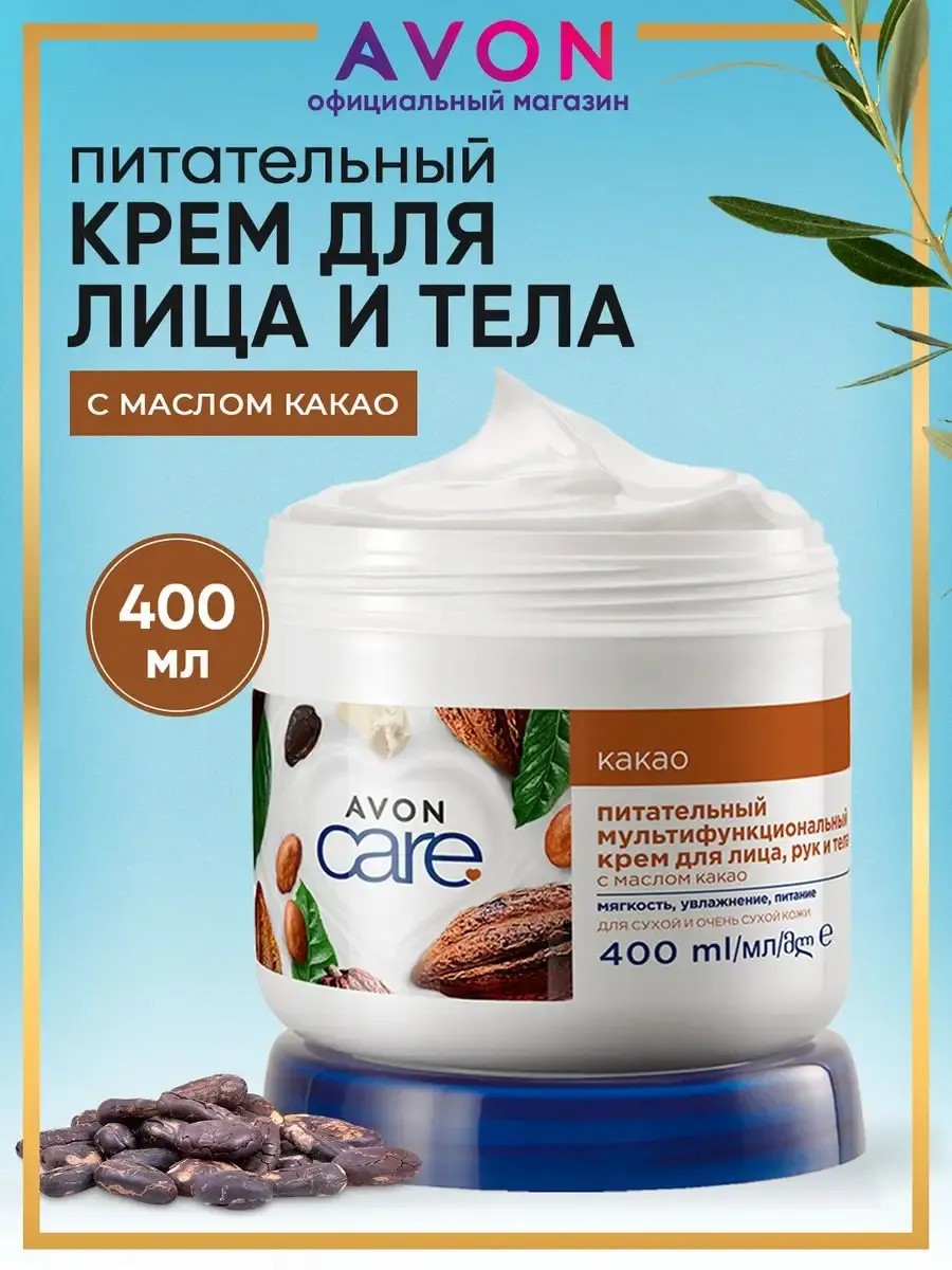 A light, multifunctional nourishing cream for the face, body, hands, and feet that intensely moisturizes, leaving the skin smooth and soft. Avocado oil is rich in monounsaturated fatty acids (MUFA), as well as the antioxidant vitamin E and minerals. It moisturizes the skin, smoothes, and has an anti-wrinkle effect. Cocoa butter is a source of oleic acid, potassium, magnesium, iron, and calcium. It has a natural SPF filter and sunscreen effect that helps reduce the appearance of scars and stretch marks. Pomegranate extract is enriched with a complex of vitamins B6, B12, and C, rejuvenates, restores dry, sensitive skin, and has an anti-aging effect. The cream is designed for day and night care. Made in Russia. Volume: 400 ml. Collect a gift set of Avon cosmetics.