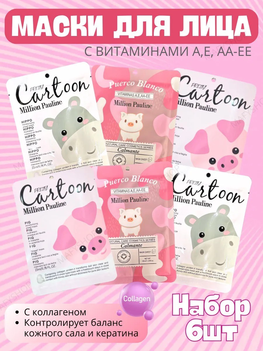 Тканевые маски для лица с милыми животными станут настоящей находкой для всех поклонниц корейской культуры! Уникальный набор включает в себя 6 штук увлажняющих и очищающих масок, каждая из которых порадует вас своим милым дизайном с изображениями хрюшки и бегемота. Набор масок с коллагеном и аитаминами А, Е обеспечит вашей коже максимальный уход. Коллаген способствует упругости и эластичности кожи. Витамины E и А успокаивают сухую кожу, разглаживают, придают эластичность и сияние. Себорегулирующая маска улучшает внешний вид кожи, сужает поры, делая её более гладкой и ровной. Подходит для сухой кожи и комбинированной. Мягкая текстура и насыщенный сыворотка с коллагеном обеспечивают увлажнение, питание и очищение. Вы сможете насладиться ощущением свежести и комфорта, а также заметить, как ваша кожа становится более сияющей и здоровой. Набор масок для лица — это идеальное решение для тех, кто хочет побаловать себя и подарить своей коже то, что ей действительно нужно. Косметический набор является отличным подарком для девушек и женщин. Его можно смело презентовать на день рождения, 8 марта или просто так, чтобы порадовать близкого человека. Подойдет как для подростков, так и для более зрелых дам, которые ценят качественную уходовую косметику. Если вы ищете идеальный бьюти бокс для девочек, наши тканевые маски для лица — это именно то, что вам нужно. Легкие в использовании и прекрасно вписываются в любой ритуал ухода за лицом. Нанесите маску на очищенную кожу, расслабьтесь на 20 минут и позвольте активным ингредиентам делать своё дело. После использования ваша кожа оживляется и становится более ухоженной. Не упустите возможность порадовать себя и своих близких качественным набором масок для лица! Маски collagen станут вашим верным спутником в уходе за лицом, а их милый дизайн добавит радости в вашу повседневную рутину. Закажите набор масок уже сегодня и откройте для себя мир китайской косметики, который подарит вашей коже здоровье и красоту!