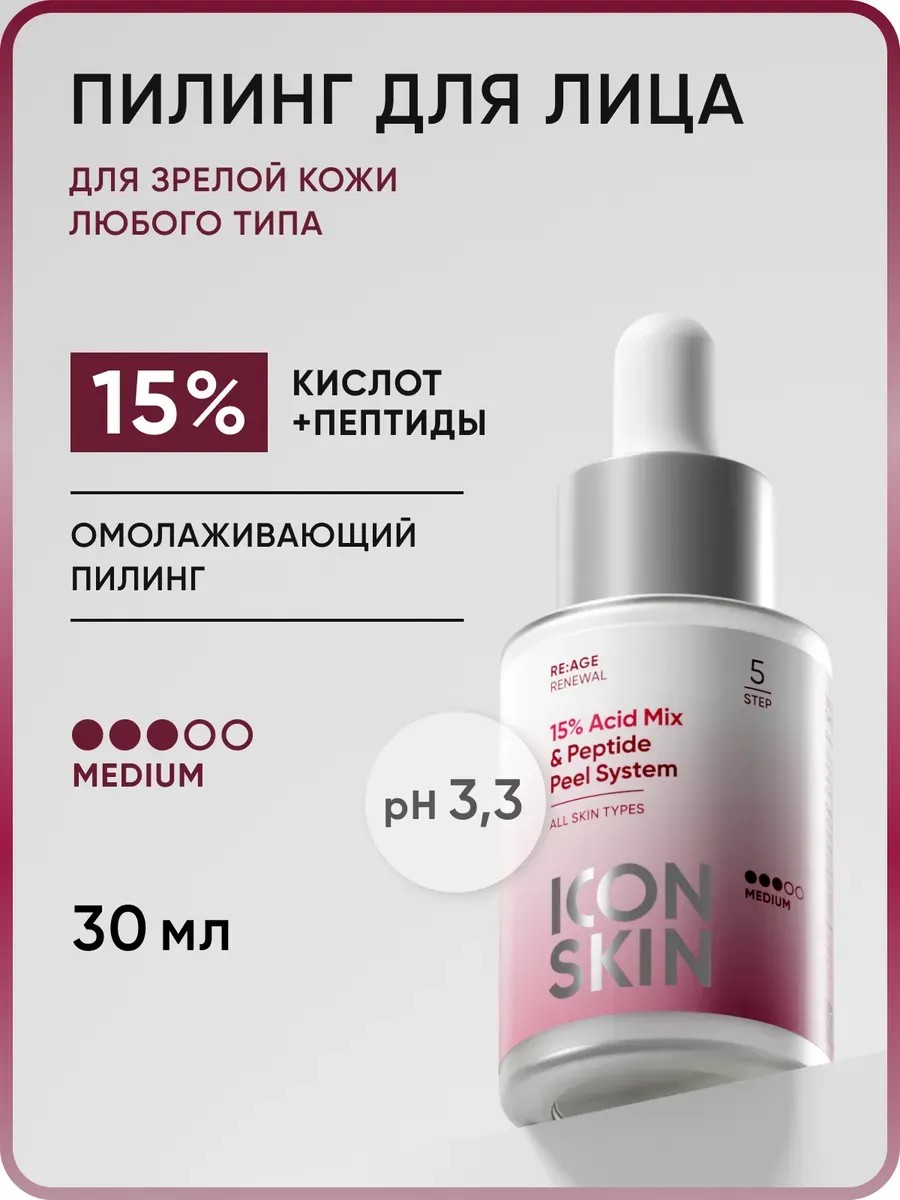 The 15% facial peel with a peptide complex is an intensive anti-aging treatment. This enhanced concentration is specifically designed for skin sensitive to acids. The peel effectively and gently renews the skin, activating natural rejuvenation processes. It stimulates elastin and collagen production, smoothes wrinkles, and improves elasticity. Recommended for: anti-aging care for all skin types. The peel produces a fine, virtually invisible exfoliation, so you won't have to change your lifestyle. The formula includes a combination of five acids: almond, lactic, ferulic, succinic, and PHA (gluconolactone). Together, they effectively yet gently exfoliate and renew the skin, provide antioxidant protection, improve microcirculation, increase hydration, and even out skin tone. Peptide complexes stimulate the synthesis of natural elastin and collagen, reduce the appearance of wrinkles, and accelerate recovery. Natural extracts of dragon's blood, goldenrod, licorice root, and daisy flowers improve regeneration and trigger the skin's self-rejuvenation processes. Result after 1 application: a more even complexion, smooth and soft skin. After a course of treatments: reduced wrinkles, renewed and elastic skin. Directions: Apply a thin layer of the peel to dry, pre-cleansed skin. Leave on for 3-7 minutes (first application - 3 minutes, with each subsequent application you can increase the time by 1 minute). Slight redness and tingling are possible during application. After the time has elapsed, rinse the peel with cool water and apply a moisturizer. Apply the peel once every 7-10 days. A course of 6-8 applications. During the day, it is necessary to use sunscreen (article 84049430). All ICON SKIN peels are designed for home use. They are atraumatic, effective, and suitable for all seasons.