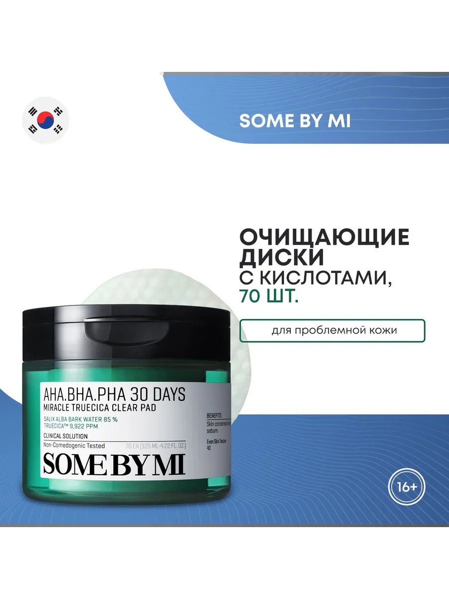 Кислотные пэды для проблемной кожи Some By Mi AHA BHA PHA 30 Days Miracle Truecica Clear Pad отшелушивают ороговевшие клетки, оказывают антибактериальное и бактерицидное действие. Борются с причинами возникновения акне и угревой сыпи, уменьшают область воспалений, снимают покраснения, эффективны в комплексной борьбе с акне.\n\nБлагодаря отшелушиванию ороговевшего слоя ускоряются внутриклеточные процессы регенерации, происходит обновление клеток, ускоряется микроциркуляция крови и повышается иммунитет, что позволяет в разы повысить качество кожного покрова. Средство тонизирует, восстанавливает оптимальный гидро-липидный баланс и значительно повышает защитные функции кожи, снижает ее чувствительность к раздражающим внешним факторам окружающей среды. Пэды также регулируют работу сальных желез, устраняют избытки кожного себума и отлично матируют кожу. Мягко осветляют следы пост-акне и нежелательную пигментацию, разглаживают рельеф кожи и улучшают цвет лица.\n\nСредство содержит 3 вида кислот:\n\n* AHA-кислоты - отшелушивают ороговевший слой эпидермиса, удаляют мертвые клетки кожи и прочие загрязнения.\n* BHA-кислота - растворяет камедоны, помогает очистить кожу от более глубоких, подкожных загрязнений и излишков себума в порах, нормализует водно-жировой баланс кожи.\n* PHA-кислота - предотвращает потерю влаги и мягко отшелушивает, успокаивает и устраняет раздражения на коже.\n* Тип: Пилинг-пэды\n* Бьюти-ингредиент: AHA-кислота, BHA-кислота, PHA-кислота, Глицерин, Центелла\n* Вид пилинга: Мультикислотный\n* Область использования: Лицо\n* Особенности состава: Натуральные экстракты, Проверено дерматологами\n* Целевая аудитория: Взрослая\n* Пол: Женский, Мужской\n* Возрастной диапазон: от 16 лет\n* Единиц в одном товаре: 70\n* Объем: 70 мл\n* Вес: 289 г\n* Упаковка: Картонная коробка, Пластиковая банка\n* Страна-изготовитель: Южная Корея