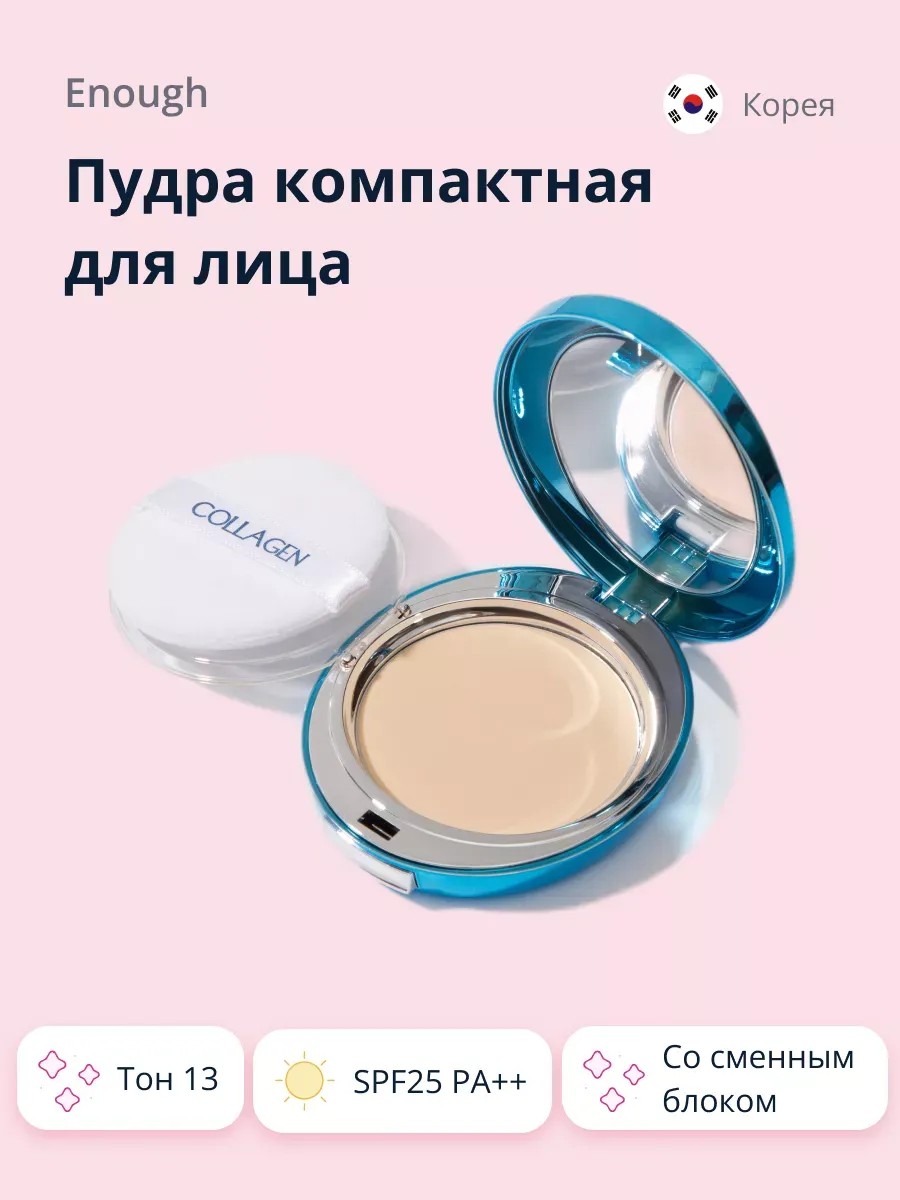 ENOUGH Collagen Hydro Moisture Two-Way Cake Compact Face Powder SPF25 PA++, Shade 13. This powder creates a perfectly even, weightless coverage without accentuating flaking. It perfectly sets makeup, mattifies, and leaves skin smooth and velvety. Hydrolyzed collagen in this Korean powder provides the necessary moisture, thereby preventing dryness and flaking. Your skin looks fresh and healthy, and its texture is more even and smooth. SPF25 protects skin from UV rays.