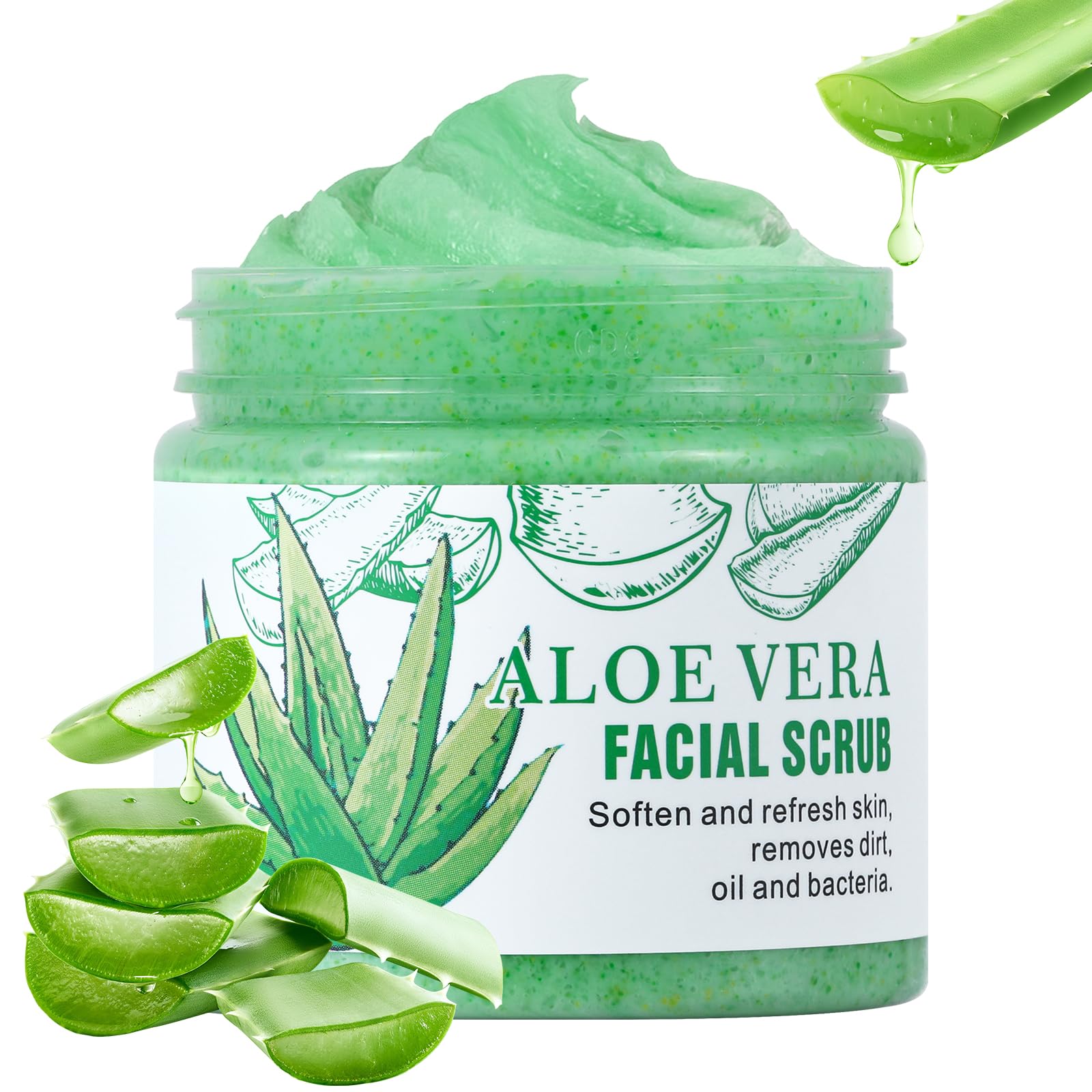 HOW TO USE: Cleanse skin,take a small amount of the aloe vera scrub and gently massage it onto damp skin,avoiding the eye area.use circular motions to exfoliate the entire face.after gentle exfoliation, rinse your face with warm water, making sure to remove all scrub particles. pat your skin dry and follow up with your regular skincare routine, such as toner and moisturizer. FACE EXFOLIATOR FOR SENSITIVE SKIN: Expertly Designed to Remove Impurities and Dead Skin Cells, We choose the ingredients of our facial scrubs very carefully to ensure that they are safe, natural and free from harmful substances. Our micro dermabrasion facial scrub have a delicate feel and are suitable for all skin types. SOOTHING AND HYDRATING: Aloe vera is renowned for its soothing properties, providing instant relief to irritated or sunburned skin. Its natural gel-like consistency helps to lock in moisture, keeping the skin hydrated and supple.Aloe vera facial scrub contains a wealth of vitamins, minerals. DEEP CLEANSING AND EXFOLIATION: Our facial scrub for women features gentle exfoliating particles that effectively remove dead skin cells, impurities, and excess oil, also cleans pores, removes blackheads for a smoother and complexion without causing irritation. FACE SCRUB WASH FOR WOMEN: This cleanser deeply cleanses your skin, removing all sorts of impurities from your skin,leaving it feeling fresh, revitalized, Regular use results in improved skin texture, making it smoother and more supple skin. Leaving Your Complexion Refreshed and Smooth.