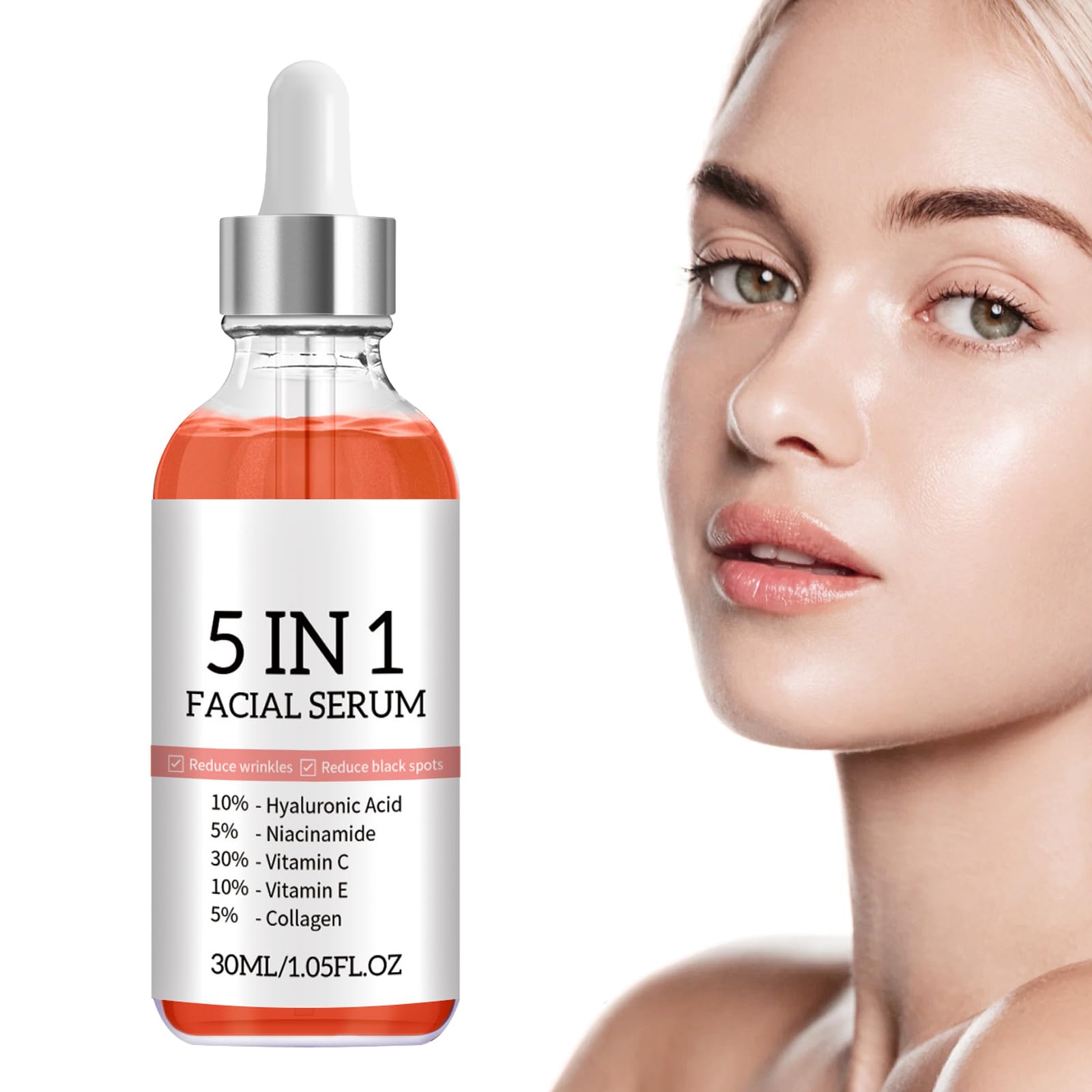 5-IN-1 FACIAL SERUM: The 5-in-1 formula effectively minimizes the appearance of stretched pores, cellulite and clogged imperfections for a smoother, more radiant and refined appearance. Moisturizing, lightweight serum that improves skin radiance and luminosity. MOISTURIZING SERUM: The face firming serum also penetrates deep into the bottom layer of the skin to moisturize dry skin and regulate the water and oil balance of the face. Our moisturizing serum ensures smooth and soft facial skin. A LIGHTWEIGHT VITAMIN C BOOSTER SERUM: Combat early signs of aging and improve skin radiance with the lightweight and hydrating Vitamin C serum. Hyaluronic acid provides rich moisture deep into the skin and helps reduce the appearance of fine lines and wrinkles. BEAUTIFUL RADIANT SKIN: 5 powerful serums in one bottle. The strongest anti-aging formula available. Super-powerful serum to combat the signs of aging. Regular use results in noticeably smoother, more radiant and younger-looking skin. FOR EVERY SKIN TYPE: Our anti-aging facial serum is suitable for all skin types, including those with dry, oily, acne-prone, sensitive and aging skin. This anti-wrinkle serum is a great choice for improving skin elasticity and restoring skin texture. Improving skin shine and soothing skin. SAFETY WARNING 1